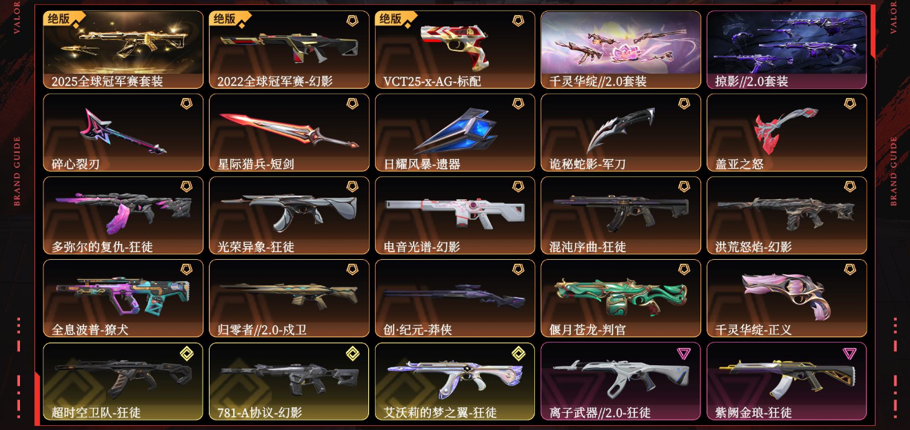 千灵华绽//2.0套装✅25冠军套✅掠影//2.0套装✅22冠军幻影✅盖亚之怒✅猫猫狂徒✅混沌狂徒;偃月苍龙 判官,侦察力量 幻影,洪荒怒焰 幻影,紫阙金琅 狂徒,混沌序曲 狂徒,光荣异象 狂徒,离子武器//2.0 狂徒,