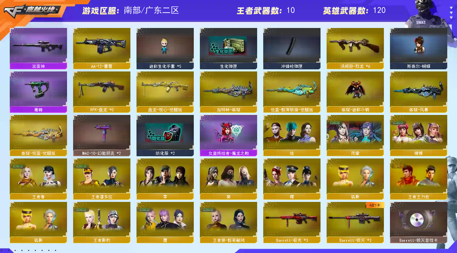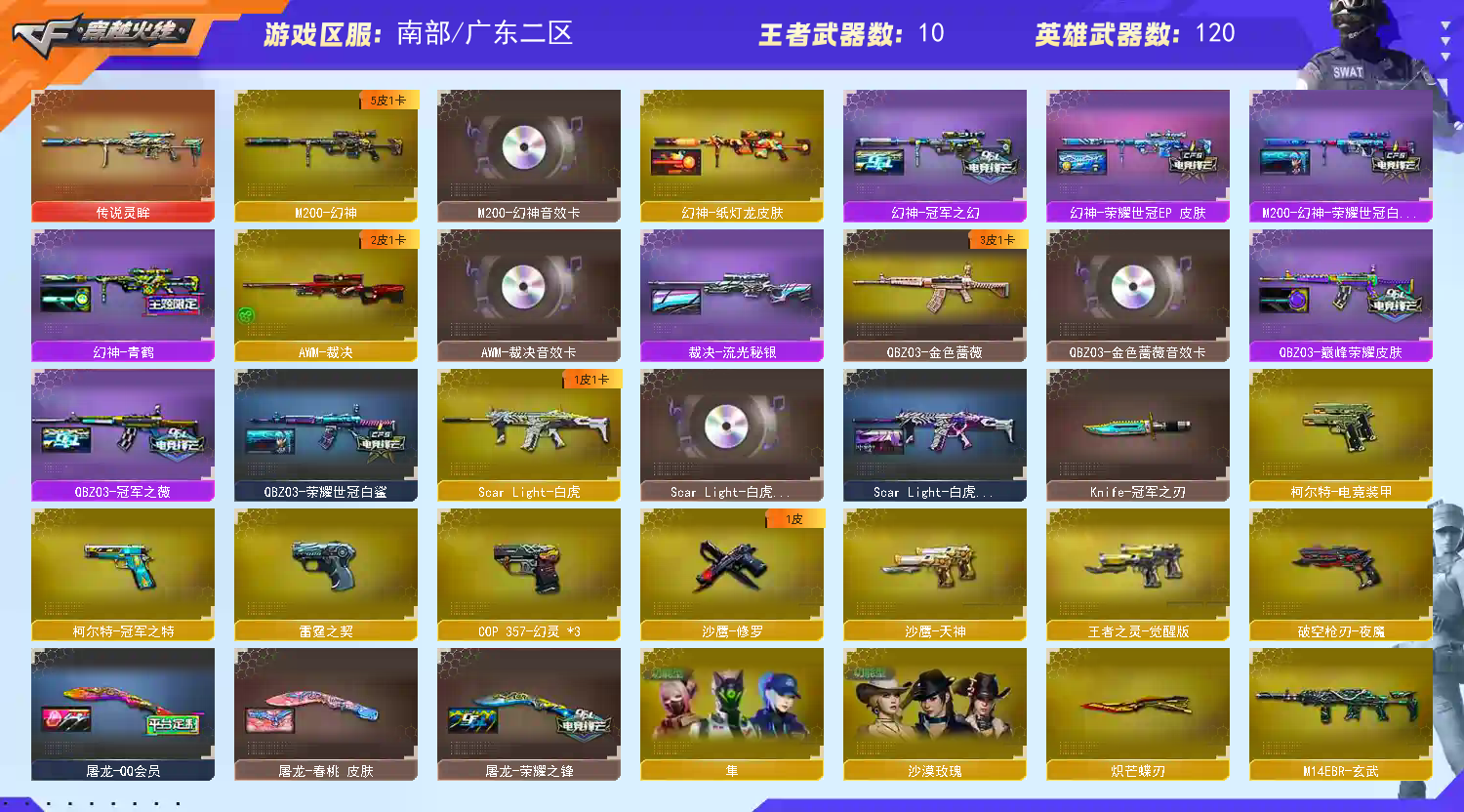 【亮点解析 幻神5皮带卡 生化满配 白虎三件套 裁决三件套 】【传说灵眸】【m200幻神+音效卡+纸灯龙+荣耀世冠ep+荣耀世冠白鲨+冠军之幻+青鹤+冠军之特+冠军之刃】【王者星神 王者风神】【6烈龙 6盘龙 炼狱*4 炽芒蝶刃 斯太尔蝴蝶 】【scar白虎+卡+暗星】【qbz金色蔷薇+卡+荣耀世冠白鲨+冠军之薇+巅峰荣耀】【朱雀】【玄武】【火麒麟+横秒之巅】【黑龙+冠军之武】【雷神+s18冠军+荣耀之魄】【黑骑士+卡+冠军之势 】【毁灭+卡+cfs2018】【极光】【裁决+卡+流光秘银 】【电竞装甲套】【武器:王者之魄 王者之城 白虎电玩 】【9手枪:修罗 天神 雷霆 夜魔 电竞装甲 幻灵*2 王者之灵 冠军之特 】【14刀具:屠龙*2 龙啸*2 擎天 *2 麒麟刺*2 尼泊尔雷霆 夜魔 王者之击 】【11雷套:雷霆雷*2 夜魔雷*2 电竞装甲*7】【小人枪:金色蔷薇空 天龙曼陀罗 炼狱小刚 斯太尔蝴蝶 】【音效卡:裁决音效卡 幻神音效卡 毁灭音效卡 黑骑士音效卡 白虎音效卡 金色蔷薇音效卡 】【四防角色:晴雅 沙漠玫瑰 鹰 雨棠 隼 王者春 王者葵惊若翩鸿 王者潘多拉 王者影豹 】;柯尔特-冠军之特,炽芒蝶刃,Knife-冠军之刃,沙漠玫瑰,隼,晴雅,RPK-盘龙,