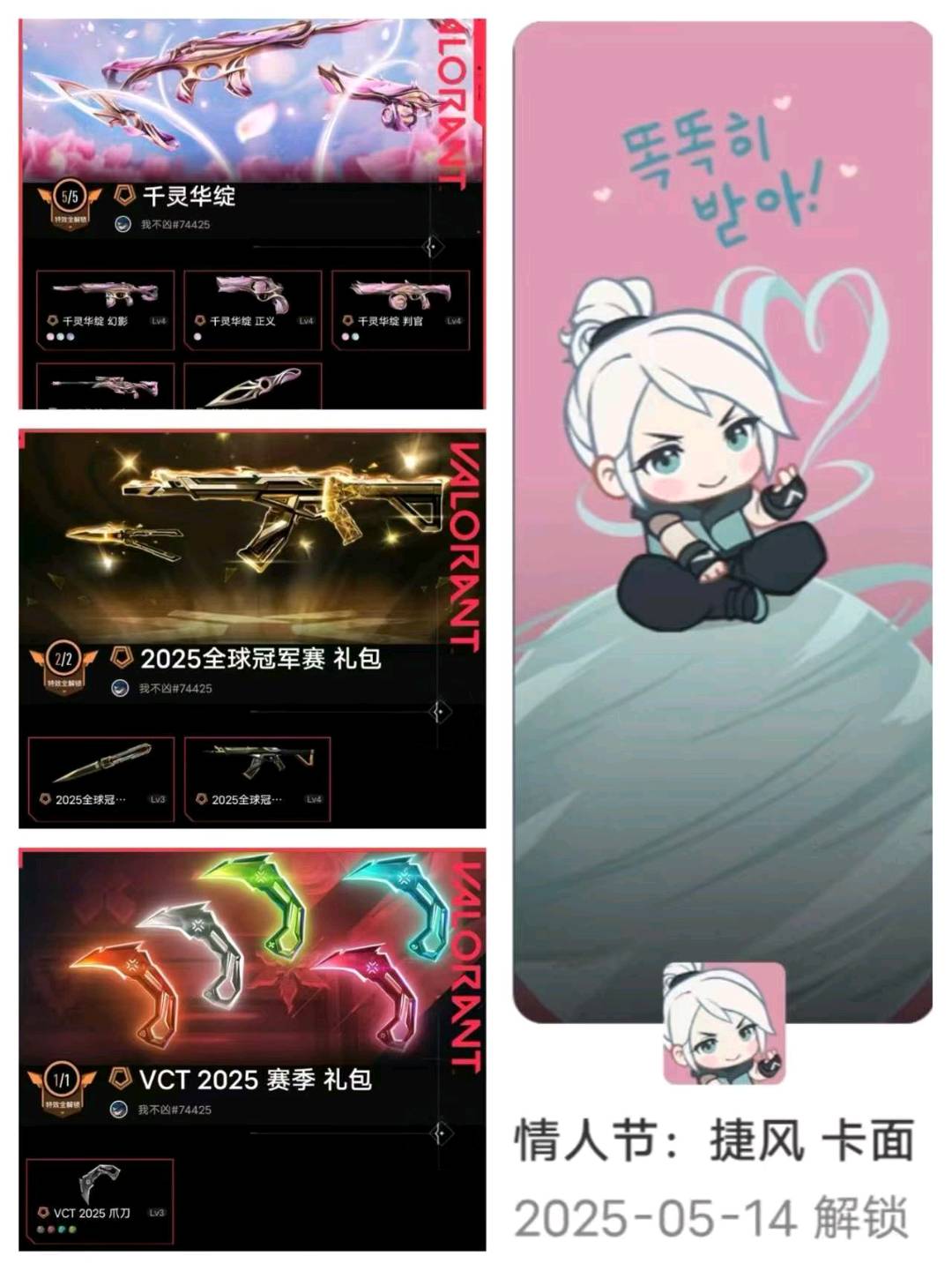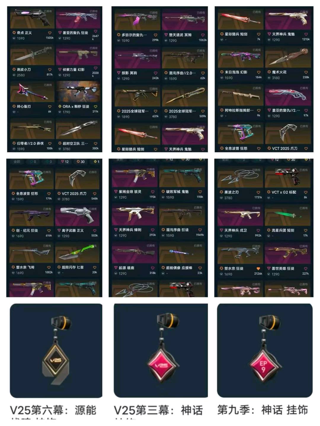 冻结看wg;黑波之刃,剥皮小刀,VCT 2025 爪刀,起源 雄鹿,盖亚的复仇 狂徒,侦察力量 幻影,天界神兵 戍卫,