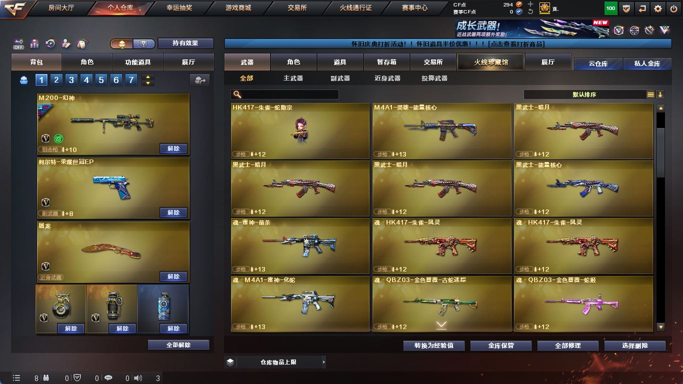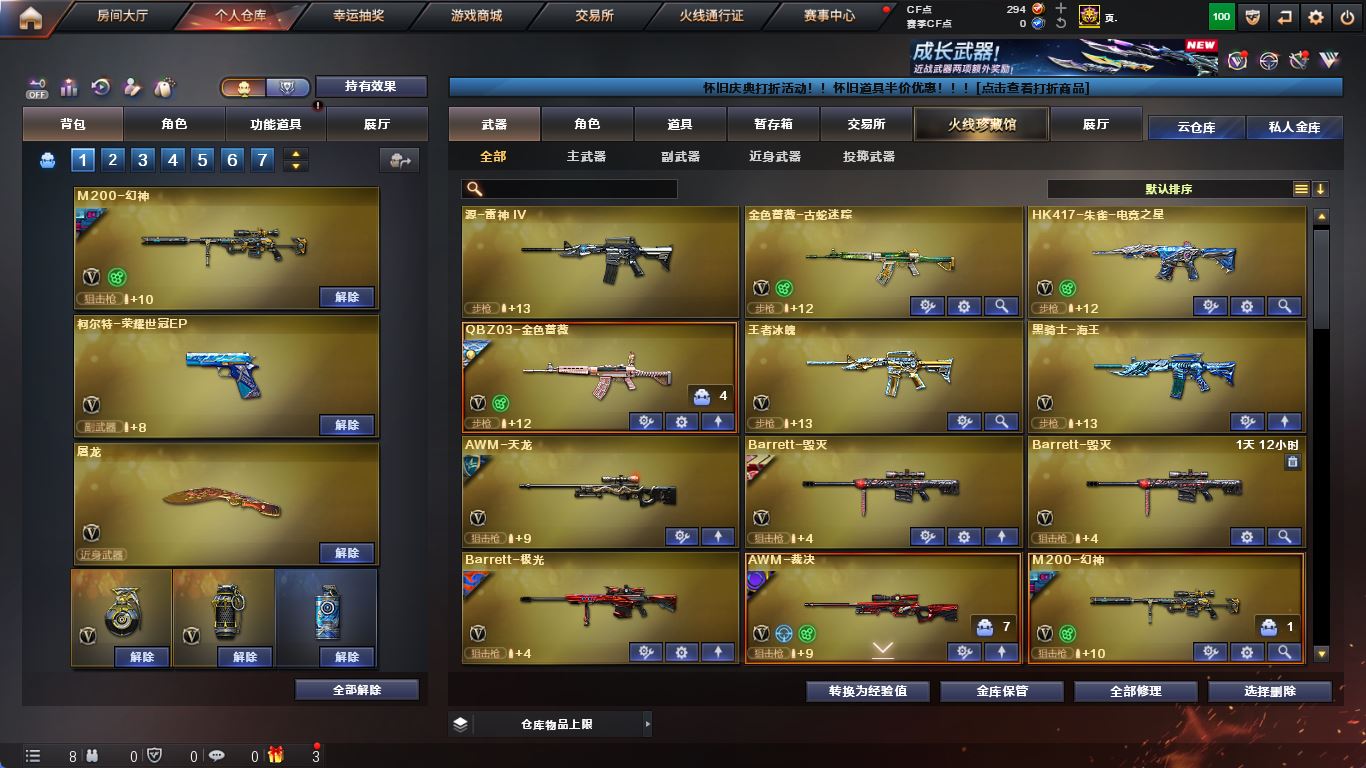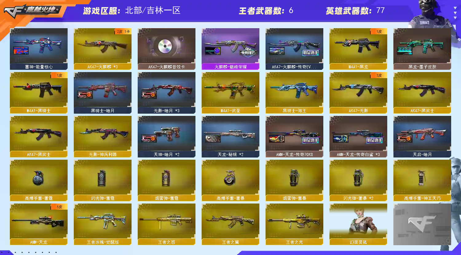 【M200-幻神+幻神-荣耀世冠白鲨】【ScarLight-白虎+冠军之虎】【QBZ03-金色蔷薇+荣耀世冠ep】【生化 3盘龙 炼狱 6烈龙】【裁决+巅峰荣耀】【毁灭+音效卡+毁灭-冠军之怒】【极光】【火麒麟+音效卡+巅峰荣耀+火麒麟-even】【黑龙】【雷神+音效卡+雷神-lgd18冠军+雷神-白鲨14冠军】【黑骑士】【无影 黑武士 】【13手枪 修罗*8 天神 荣耀世冠ep】【20近战 屠龙*6 龙啸*5 擎天 麒麟刺*4 斩神刀雷暴 王者之击】【手雷 雷霆雷 雷暴雷】【角色 葵 战地猎狐 雪域霜狐 云海玲珑】;荣耀世冠-柯尔特,RPK-盘龙,QBZ03-金色蔷薇,M200-幻神,Scar Light-白虎,