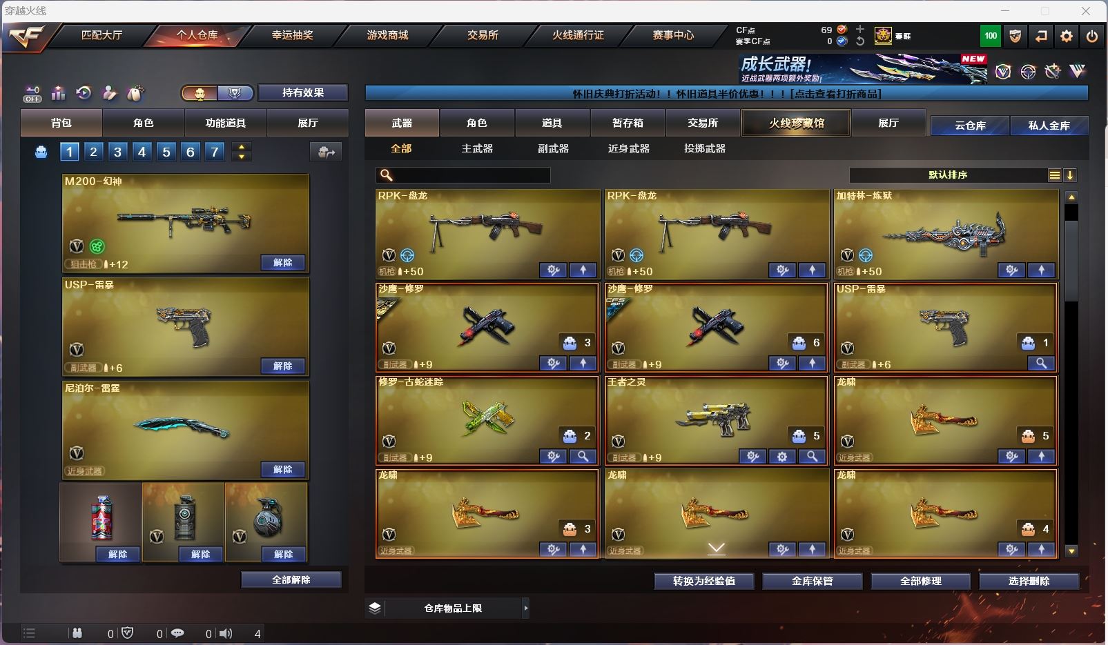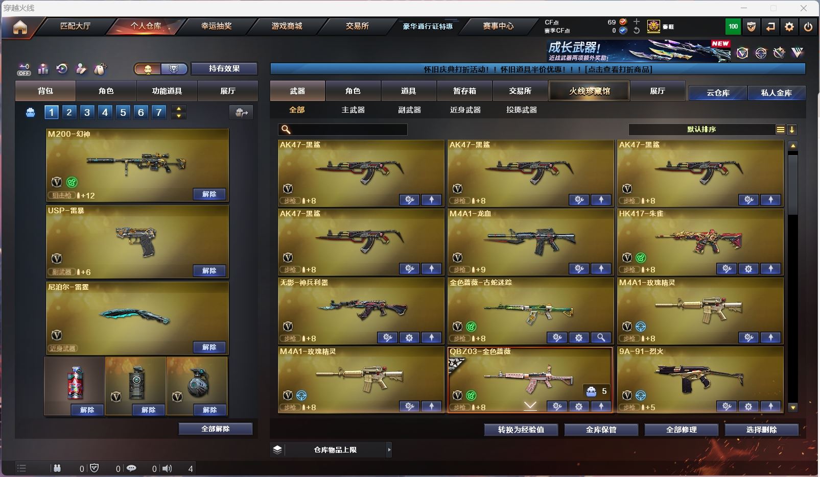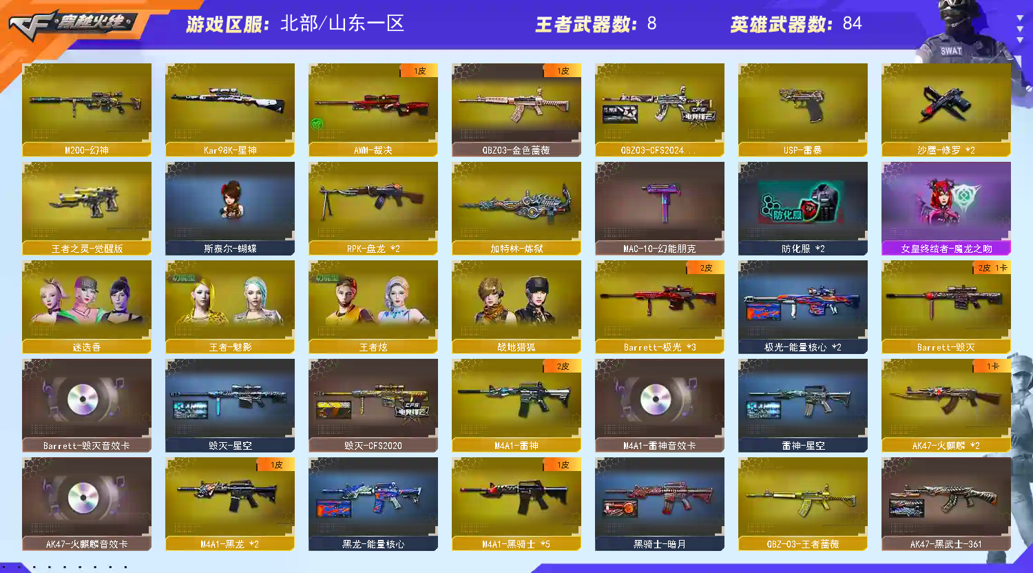 【m200幻神+usp雷暴】【98k星神】【qbz金色蔷薇+cfs2024】【朱雀】【火麒麟+卡】【黑龙】【雷神+卡】【黑骑士*5】【毁灭+卡】【极光】【裁决 】【武器:黑武士 王者冰魄 海王 盘龙*2 炼狱 qbz王者蔷薇 】【5手枪:修罗*2 usp雷暴 王者之灵】【12刀具:龙啸*5 擎天 麒麟刺 尼泊尔雷霆 斩神刀雷暴 堕天神 竞技荣光*2】【9雷套:雷霆雷 雷暴雷*4 堕天神雷*4】【小人枪:斯太尔蝴蝶 】【音效卡:毁灭音效卡 雷神音效卡 火麒麟音效卡 】【四防角色:王者魅影 王者炫 职业经理;USP-雷暴,RPK-盘龙,QBZ03-金色蔷薇,M200-幻神,Kar98K-星神,
