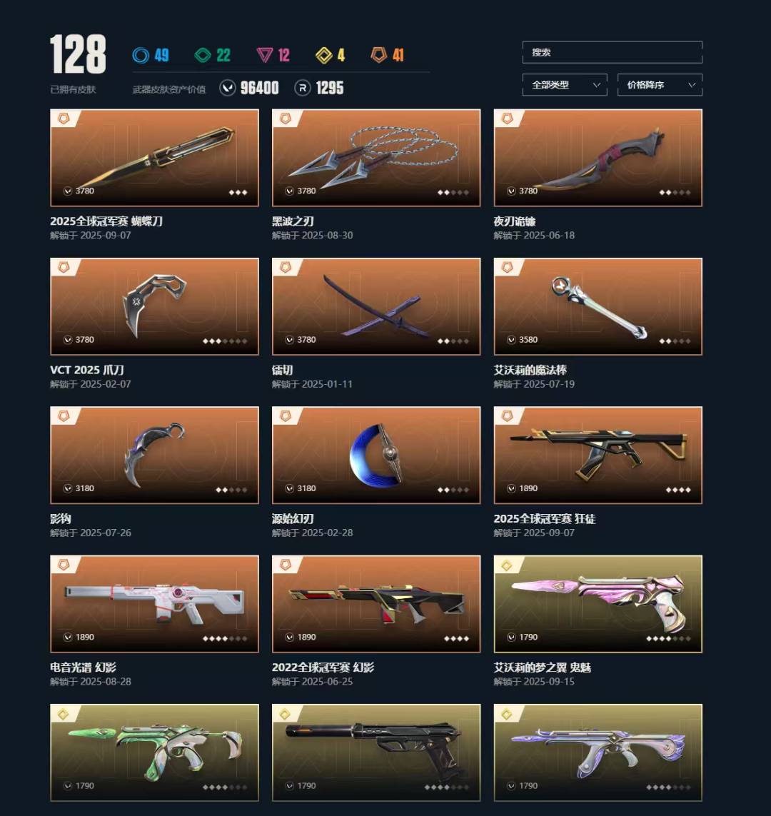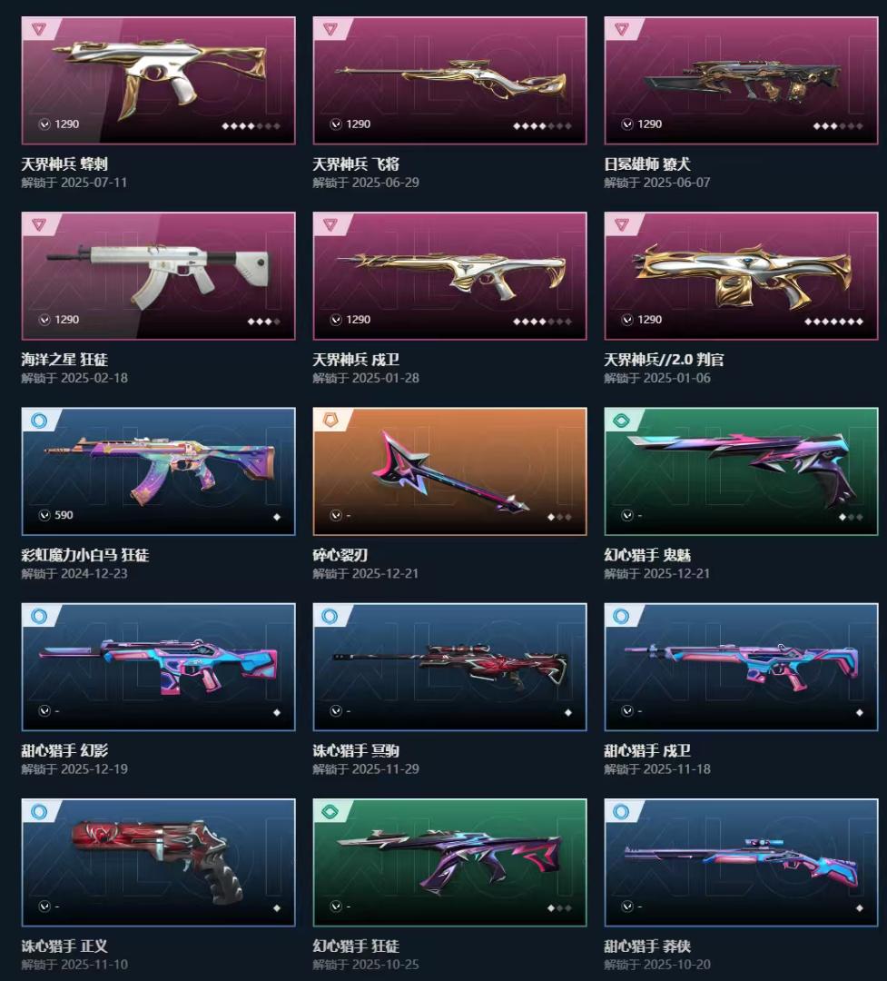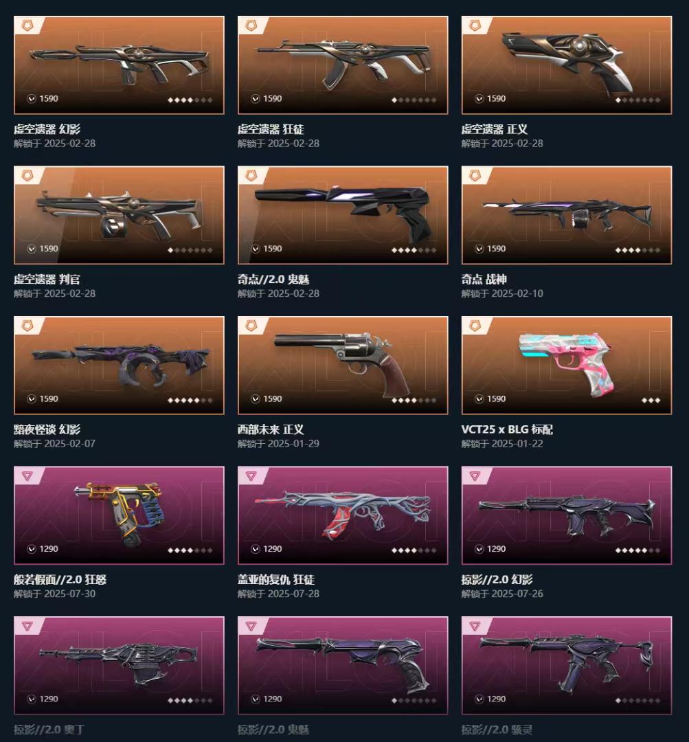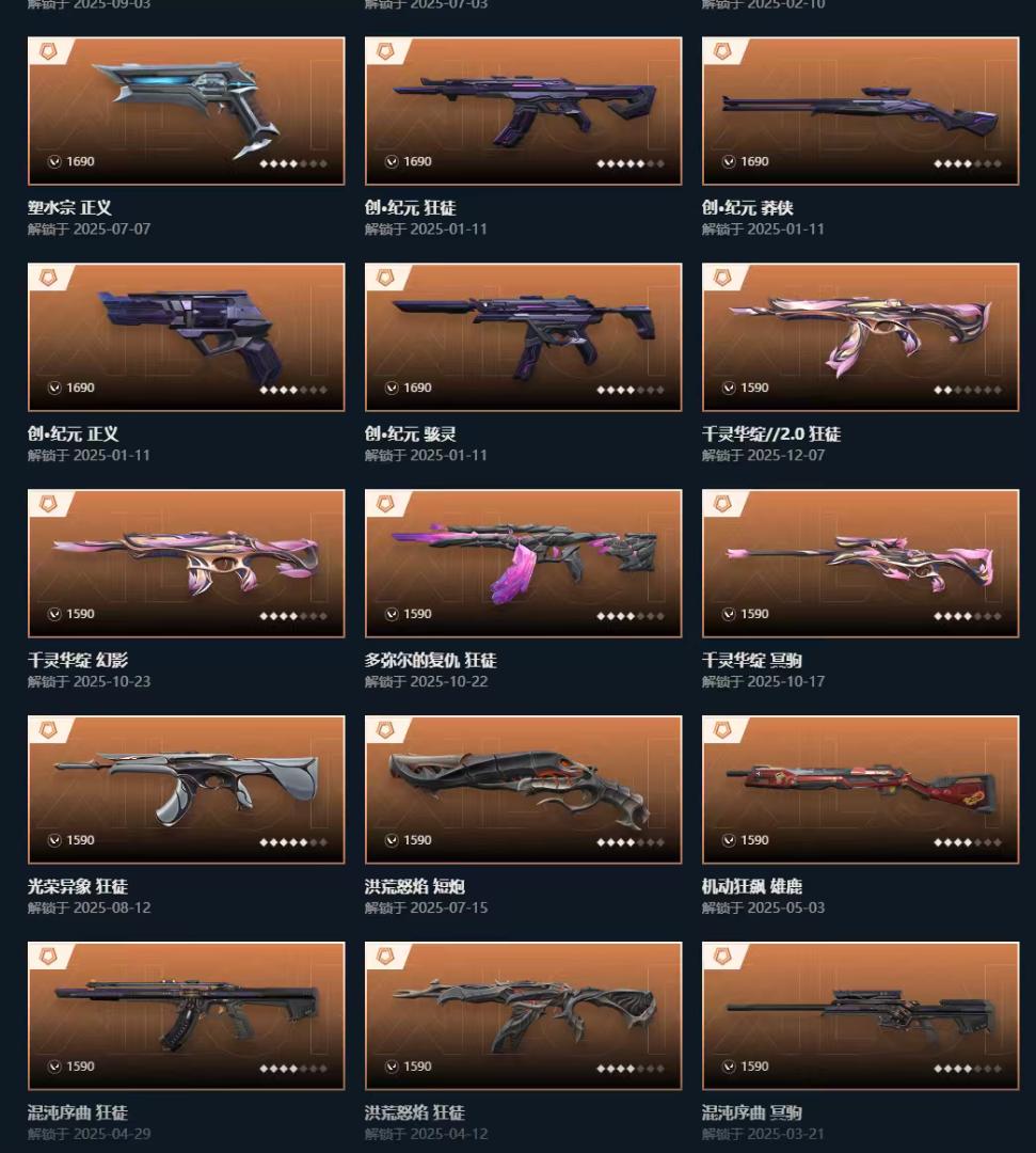 秒解10W库+莲花多弥儿小猫光荣16狂徒+25/22冠军25爪刀掠夺2.0套+黑波莲花幻影虚空纪元套;奇点 战神,黑波之刃,镭切,VCT 2025 爪刀,盖亚的复仇 狂徒,虚空遗器 狂徒,洪荒怒焰 狂徒,