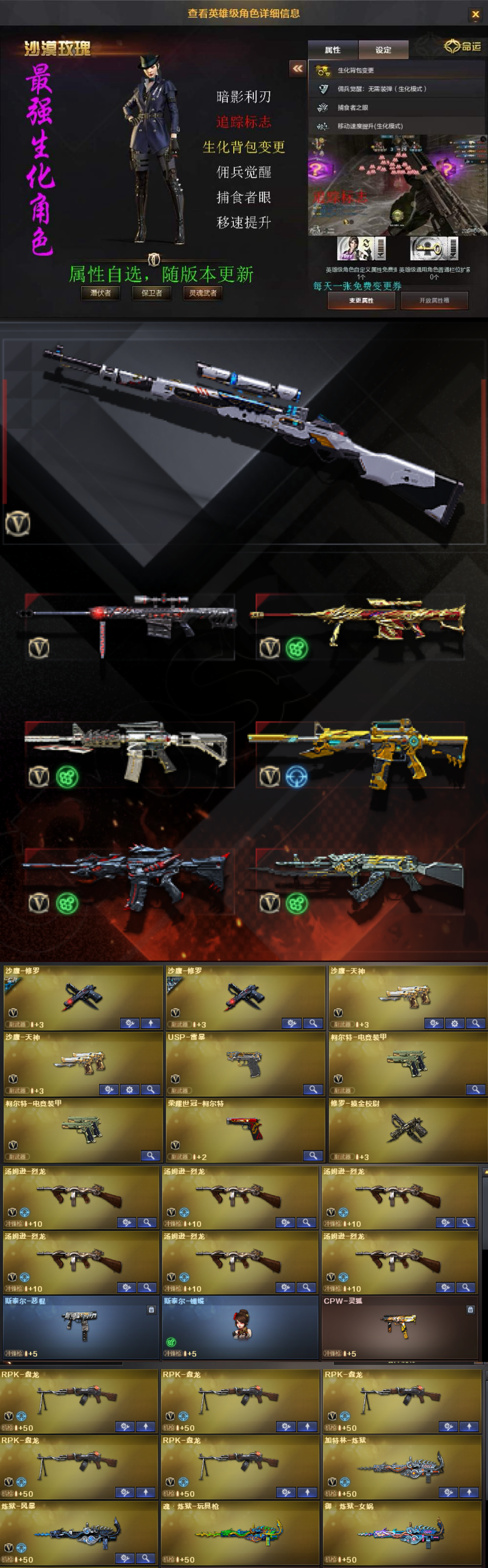 111111;USP-雷暴,荣耀世冠-柯尔特,炽芒蝶刃,沙漠玫瑰,RPK-盘龙,Scar Light-白虎,Kar98K-星神,