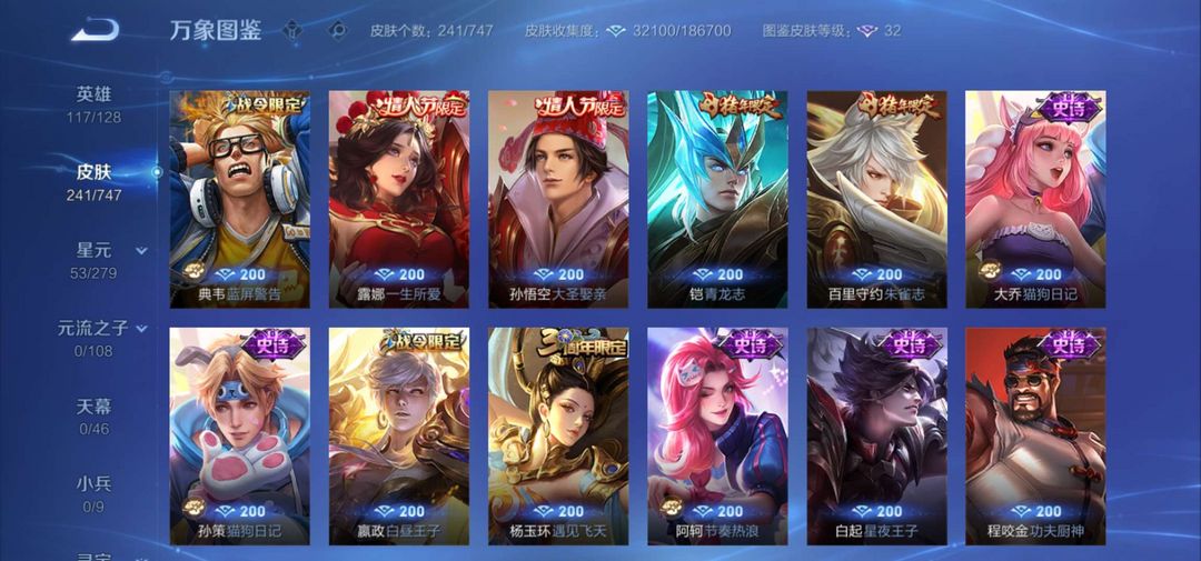 v10、524皮5水4无双、遇见神鼓、齐天大圣、白虎志、韩信荣耀典藏、72传说、愿照·九州拓、时之魔女、瑶无双、青丘、九尾、神器明辉仪