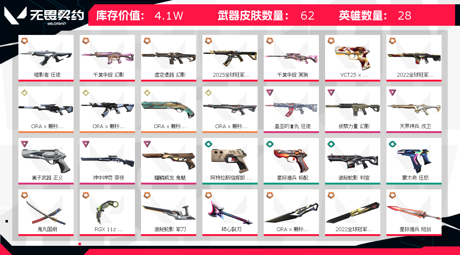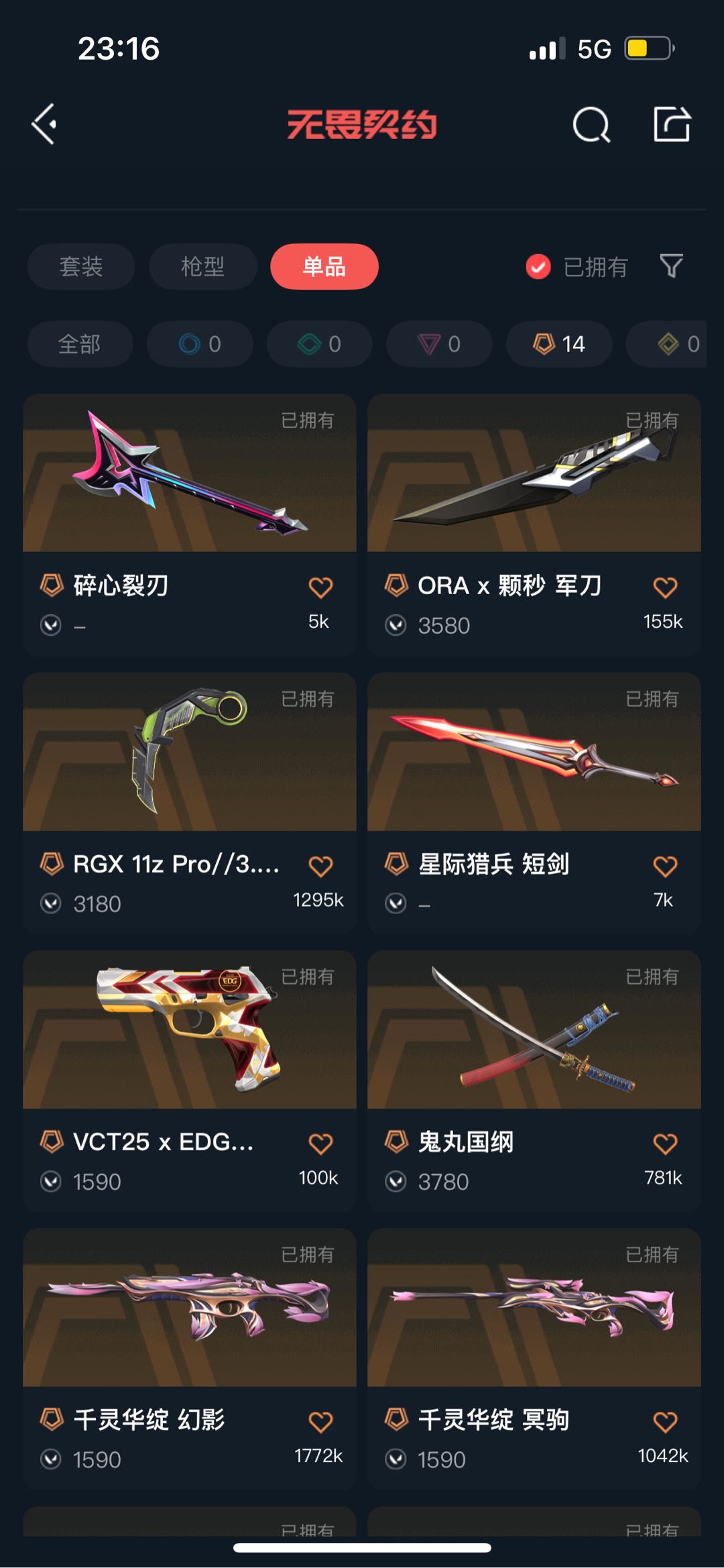 首页 > 租号大厅 > 无畏契约-wegame > wegame/wegame > 颗秒套/22冠军套/盖亚狂徒/侦察幻影/千灵幻影/千灵冥驹/天界神兵戍卫/RGX11zPro3.0刀