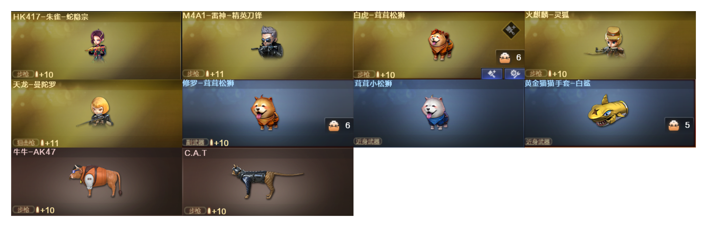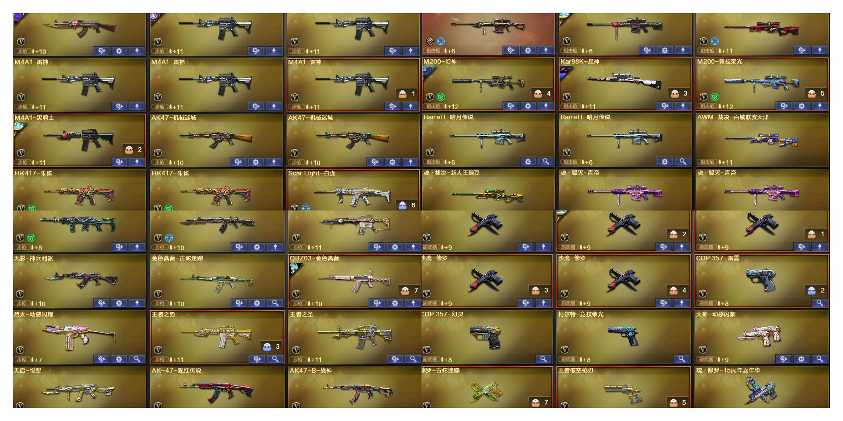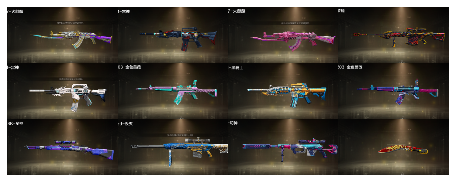 幻神+幻神荣耀世冠白鲨皮肤+音效卡 幻神竞技荣光 星神漫游 火麒麟巅峰荣耀 QBZ传奇宠儿 QBZ荣耀世冠白鲨 毁灭冠军之怒 雷神LGD 黑骑士冠军之势+音效卡 白虎 M14玄武 hk417朱雀+音效卡 炼狱+音效卡 裁决 QBZ天罚 王者破空枪刃。。。。。 关小雨 鹰 雨棠;电竞教官-云悠悠,RPK-盘龙,QBZ03-金色蔷薇,M200-幻神,Scar Light-白虎,Kar98K-星神,