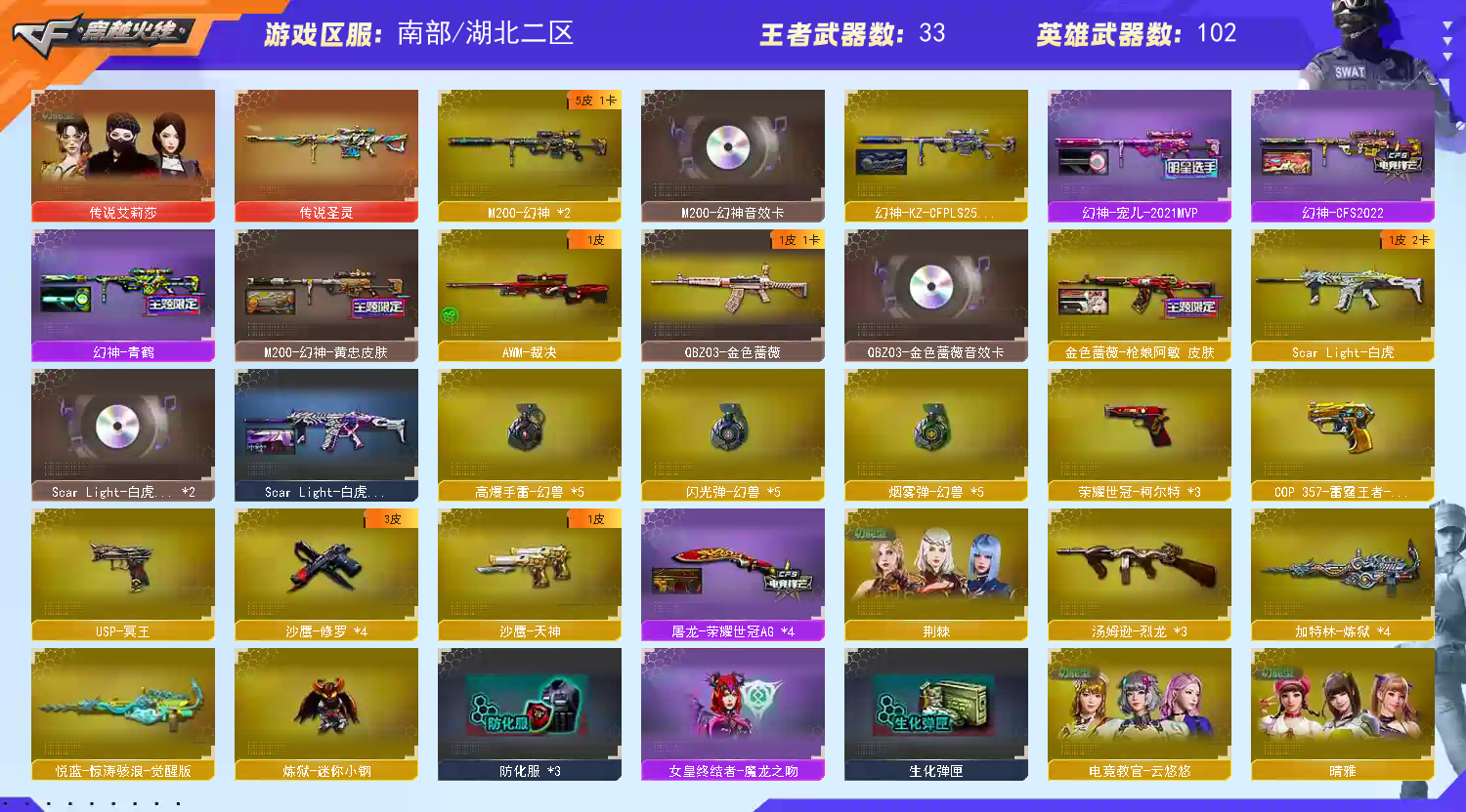 首页 > 租号大厅 > 穿越火线 > 电信区/湖北二区 > 传说艾丽莎,幻兽五套,幻神5皮最新kz皮肤+幻神音效卡,usp冥王,蝴蝶刀