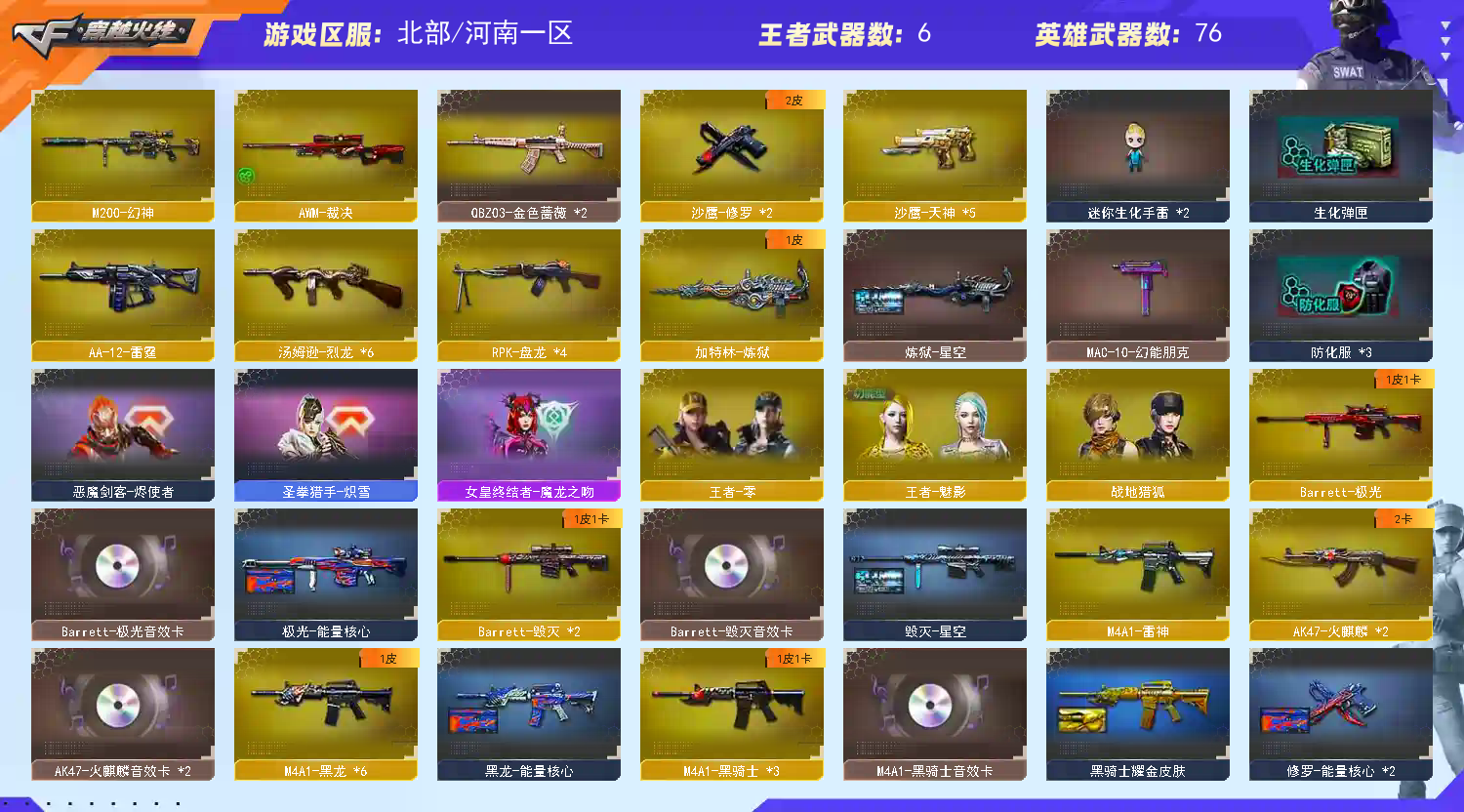 禁止利用账号进行开挂,使用辅助违规软件诈骗等违规操作。毁号行为涉及毁坏虚拟财产罪及计算机安全罪,请文明游戏素质游戏,让我们共建美好租号平台!;RPK-盘龙,QBZ03-金色蔷薇,M200-幻神,