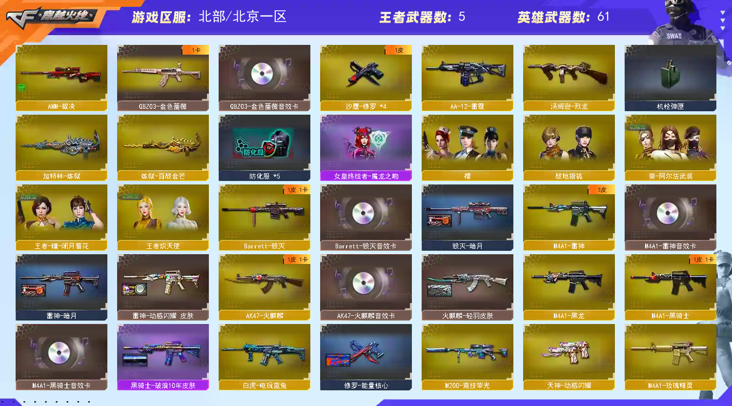 全装可排位,M200竞技荣光、AWM-裁决、王者之武、4防角色、雷神火麒麟毁灭音效卡,主武器全系列英雄级,各种稀有枪械皮肤等,还有挑战装备热门挑战武器等;QBZ03-金色蔷薇,