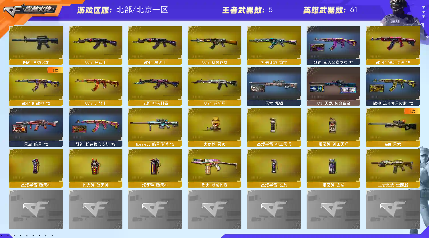 首页 > 租号大厅 > 穿越火线 > 网通区/北京一区 > 全装可排位可挑战,M200竞技荣光、AWM-裁决、4防角色、雷神火麒麟毁灭音效卡,主武器全系列英雄级