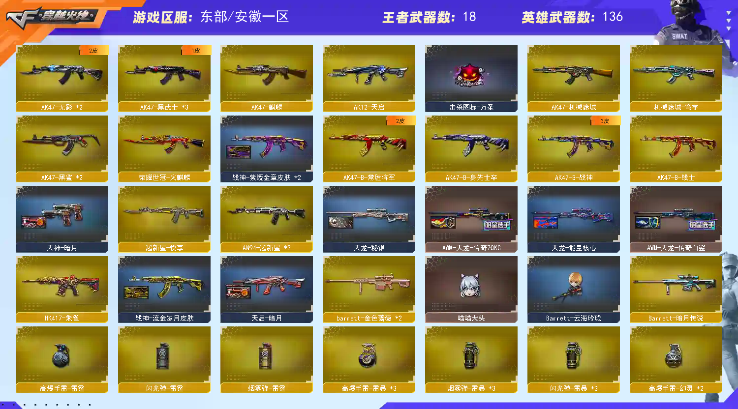 弹夹AC全套,各类属性人物,荣耀皮肤,五虎将全皮肤;荣耀世冠-柯尔特,晴雅,RPK-盘龙,QBZ03-金色蔷薇,M200-幻神,Scar Light-白虎,