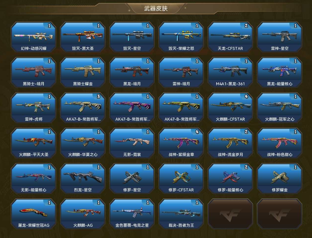 【幻神-动感闪耀/幻神音效卡】【斯泰尔蝴蝶】【星神】135V,魅影/樱/葵/王者-零-传说之路/王者炫/王者春/葵-阿尔法武装/雪域霜狐/奇洋探员/云海玲珑/乔伊教练/职业选手/幽/空;【武器皮肤45】:/毁灭-黑大圣/毁灭-星空/毁灭-荣耀之怒/天龙-CFSTAR*2/雷神-星空/黑骑士-暗月/黑骑士耀金/黑龙-暗月/雷神-暗月/M4A1-黑龙-361/黑龙-能量核心/雷神-虎