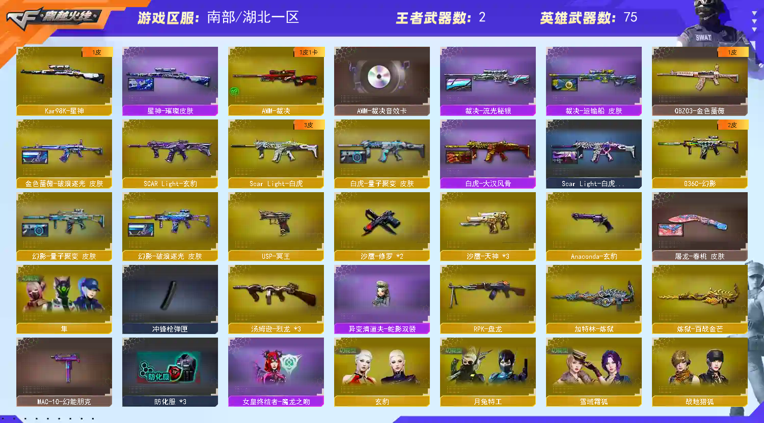 七套玄豹 四防玄豹角色小女帝 全套裁决皮肤音效卡什么都有 g36幻影 白虎 白虎皮肤都是齐全的 原始天尊有源朱雀 黑骑士海王 机械迷城苍穹 正儿八经爆破号基本的热门武器都有皮肤 因为是自己玩的号禁止挂机 禁止中途退出;隼,RPK-盘龙,QBZ03-金色蔷薇,G36C-幻影,Scar Light-白虎,Kar98K-星神,