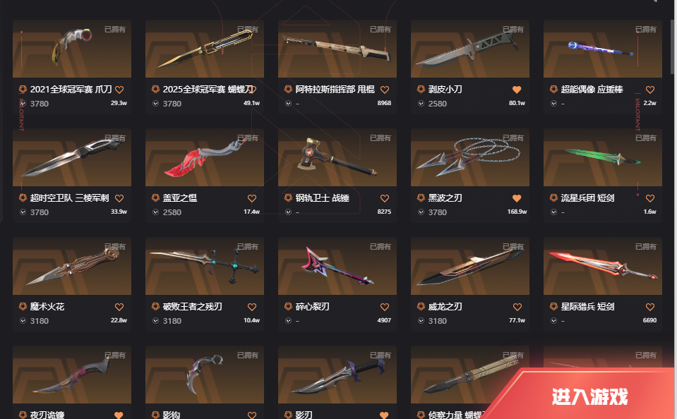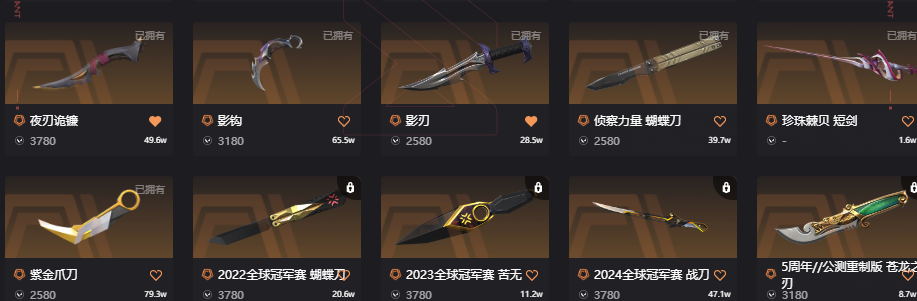 11万库存三棱军刺套装25冠军猫猫狂徒盖亚紫金末日泡泡;黑波之刃,紫金爪刀,剥皮小刀,威龙之刃,盖亚的复仇 狂徒,虚空遗器 狂徒,洪荒怒焰 狂徒,