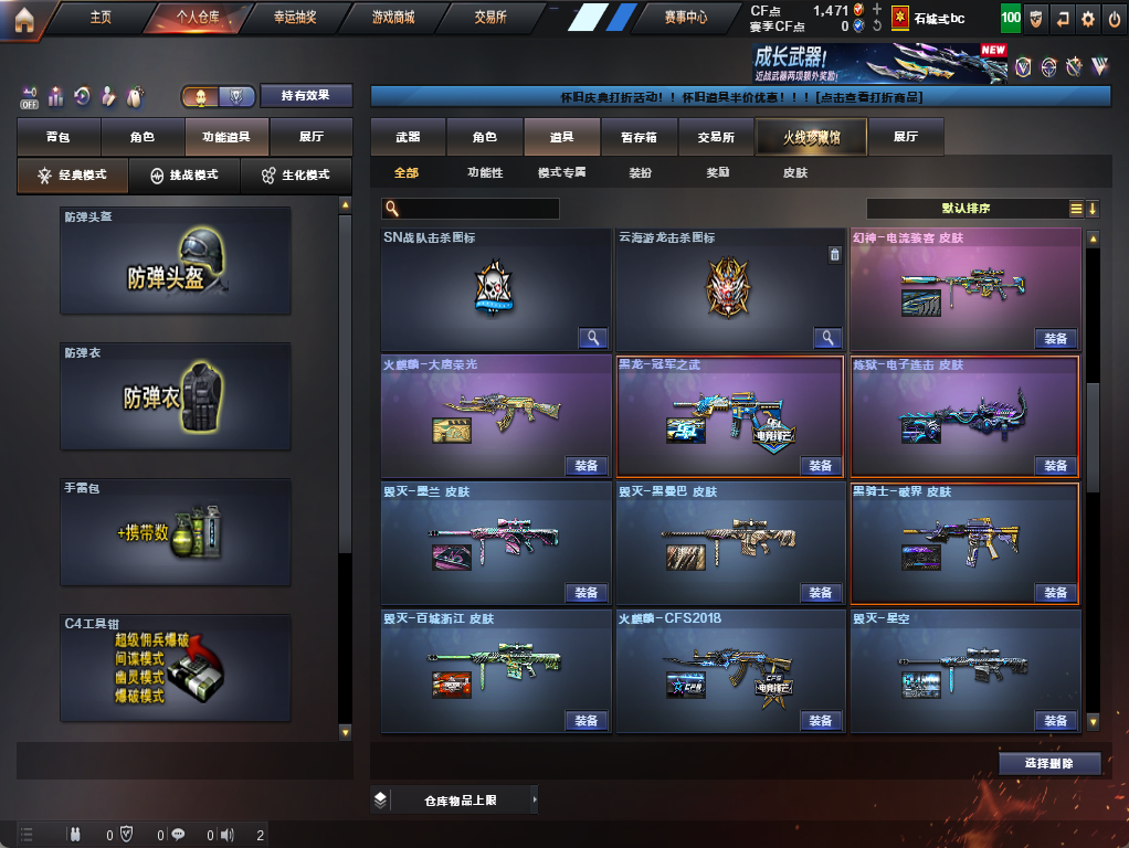 各种武器装备都有,满足一切模式需求;USP-雷暴,电竞教官-云悠悠,王者沙漠玫瑰,QBZ03-金色蔷薇,M200-幻神,Scar Light-白虎,