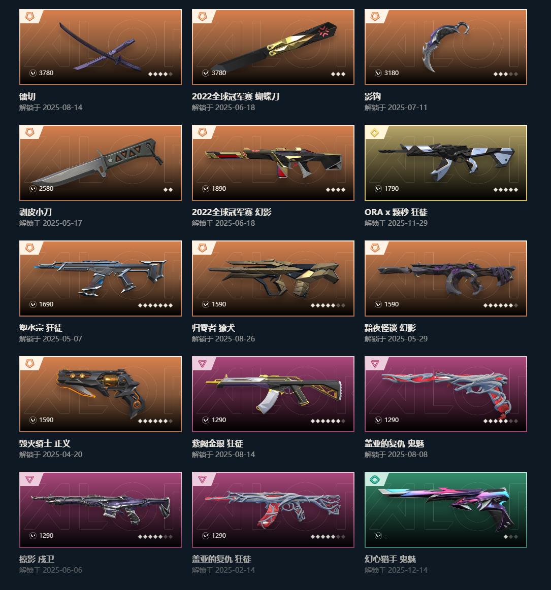镭切/影钩/剥皮小刀/22冠军蝴蝶刀/颗秒狂徒/塑水宗狂徒/22冠军幻影/盖亚狂徒/盖亚鬼魅/正义