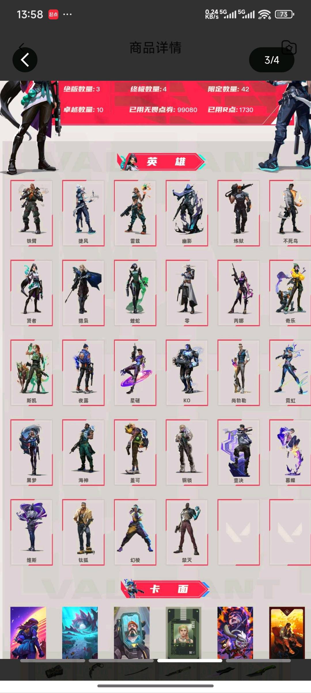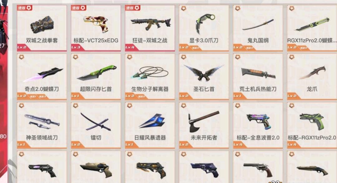Lv153|铂金III, 刀皮数量14,枪皮数量110(绝版3限定42终极4卓越10);皮肤资产价值99080,已用R点1730;【刀皮】:近战武器-双城之战拳套,近战武器-显卡3.0爪刀,近战武器-鬼丸国纲,近战武器-RGX11zPro2.0蝴蝶刀,近战武器-奇点2.0蝴蝶刀,近战武器-超限闪存匕首,近战武器-生物分子解离器,近战武器-圣石匕首,近战武器-荒土机兵热能刀,近战武器-龙爪;西部未来 奥丁,镭切,起源 雄鹿,上古龙炎 判官,盖亚的复仇 狂徒,洪荒怒焰 狂徒,堕天遗武 狂徒,