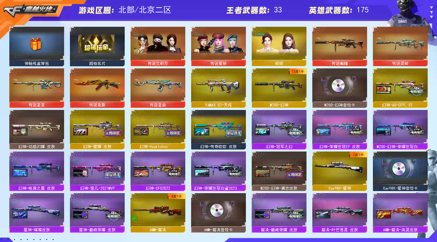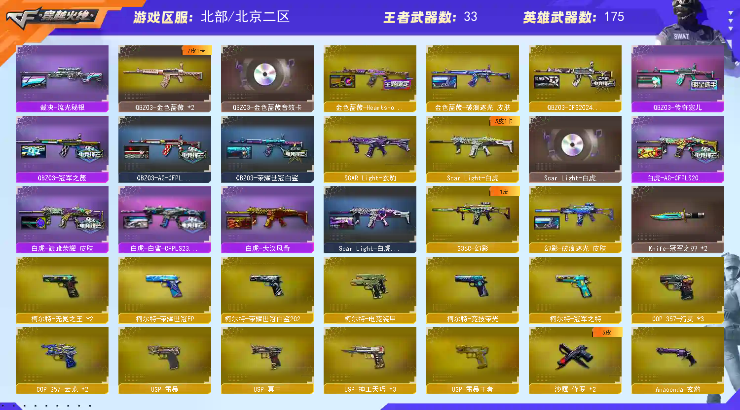 [租号必看] 账号有任何异常,撤单后会及时处理 1.网络不是法外之地,请各位绿色游戏 2.游戏快结束不要开排位,排位禁止中途退出,恶意退出游戏导致排位禁赛的情况会被拉黑 3.游戏中禁止挂机、演员、辱骂故意掉分等情况发生 4上号秒退是因为您的电脑不是在正常运行TX游戏反作弊,游戏之前需要安装【反作弊预启动模式】并重启电脑 5 祝愿老板们心想事成、步步高升、鸿运当道、财源滚滚!若您对此账号使用满意还请点个收藏不迷路,期待您的再次租赁! [副武器/手枪] COP357-幻灵 COP357-雲龙 柯尔特-竞技荣光 柯尔特-荣耀世冠白鲨2023 柯尔特-冠军之特 柯尔特-荣耀世冠EP 柯尔特-无冕之王 USP-雷暴 USP-冥王 USP-雷暴王者 USP-神工天巧 王者破空枪刃 Anaconda-玄豹 [近战武器] Knife-冠军之刃*2 炽芒蝶刃*2[冠军炽芒] 屠龙[荣耀之锋,破浪逐光,巅峰荣耀] 王者之锋 王者玉锋 王者冰锋 屠龙-电竞之星 龙啸[冠军之啸] 擎天[冠军之击] 擎天-竞技荣光 雷霆王者之锋 王者云击 斩神刀-雷暴 丛林匕首-玄豹 龙啸-热带海洋 黄金猫猫手套-白鲨 [主武器/狙击枪] 幻神[荣耀世冠EP,黄忠,传奇欧欧,冠军之幻,荣耀世冠白鲨2023,荣耀世冠白鲨,AG-S24冠军,CFS2022,动感闪耀,宠儿,星耀,Heartshot,电竞之星] 星神[巅峰荣耀,璀璨] 裁决[巅峰荣耀] 传说幽瞳 传说灵眸 传说圣灵 毁灭[冠军之怒] 极光[高能霹雳] VSK94-金蚀 [主武器/步枪] 传说夜影 传说圣谕 G36C幻影[破浪逐光] QBZ191-银翼 FAMAS G2-天戎 SCAR Light-玄豹 SCAR Light-白虎[巅峰荣耀,暗星,白鲨-S23冠军,AG] QBZ03-金色蔷薇[冠军之薇,破浪逐光,传奇宠儿,荣耀世冠白鲨,CFS2024,AG] QBZ03-天罚[孙权] 雷神[十周年荣耀之魄珍藏版] 王者凌虎 白虎之魄 青龙之魄 王者玄武 八面凌龙 白虎-迷你小艾 [音效卡] 幻神音效卡,星神音效卡,白虎音效卡,金色蔷薇音效卡,天罚音效卡,毁灭音效卡,裁决音效卡,极光音效卡,朱雀音效卡,雷神,黑骑士,火麒麟,黑龙音效卡 [角色] 传说艾莉莎[四防] 传说星骇[四防] 鹰[四防] 隼[四防] 云悠悠,关小雨,研,岚兮儿[四防] 晴雅,妮妮,影豹,月兔特工[四防] 兰-巾帼英雄,机械姬[三防] 王者岚兮儿,王者春,王者潘多拉,王者晴雅,王者沙漠玫瑰[爆破四防] [投掷武器] 雷暴,电竞装甲,竞技荣光,玄豹,雷暴王者,雷霆王者 [生化] 隼[四防] 八面凌龙[不朽玄君] 6烈龙 异变清道夫-蛇影双娇 斯太尔-蝴蝶 斯太尔-枪娘暗刃 5盘龙 2炼狱[电子连击] 双蝴蝶刀[冠军炽芒] 王者玄武 时空猎手-幻影猎手 终极猎手-荒漠刀客;USP-雷暴,柯尔特-无冕之王,USP-雷暴王者,柯尔特-荣耀世冠白鲨2023,柯尔特-冠军之特,炽芒蝶刃,Knife-冠军之刃,
