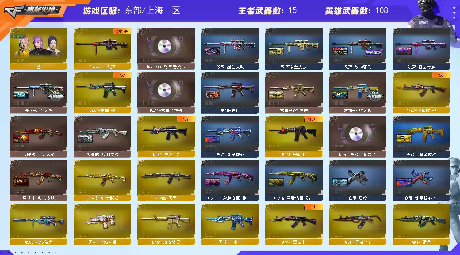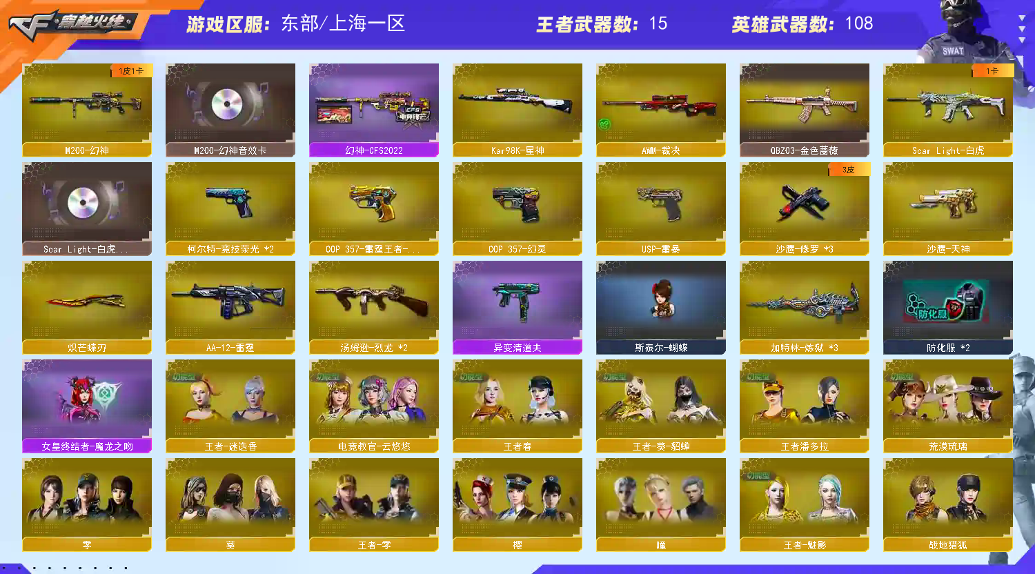 【M200-幻神+幻神-CFS2022+M200-幻神音效卡】【Kar98K-星神】【Scar Light-白虎+Scar Light-白虎音效卡】【QBZ03-金色蔷薇】【王者之势-觉醒版/王者之心-觉醒版/王者之击-觉醒版/王者芳薇-觉醒版】【柯尔特-竞技荣光(2)/USP-雷暴/COP 357-幻灵/沙鹰-天神/沙鹰-修罗(3)/天神-动感闪耀/修罗-古蛇迷踪/COP 357-雷霆王者】【炽芒蝶刃/麒麟刺/龙啸(5)/龙啸-烈火龙威/擎天(2)/擎天-竞技荣光/屠龙(4)/屠龙-动感闪耀/斩神刀-雷暴/唐刀-古蛇迷踪】【竞技荣光套装/雷暴套装】【2烈龙/3炼狱】【斯泰尔-蝴蝶】【王者青龙/王者之光/王者之锋/王者之啸/超新星-悦享】【迷迭香/雅典娜/王者-瞳/王者零-传说之路/王者-葵-貂蝉/王者-魅影/王者春/王者-迷迭香/王者潘多拉/乔伊教练/女主播/职业选手/流浪蔷薇/灵狐者-职业经理/空/灵狐者-黄金海岸/飞虎队-X】【M4A1-雷神音效卡/M4A1-黑骑士音效卡/Barrett-毁灭音效卡】【毁灭-冠军之怒/毁灭-战神张飞/毁灭耀金皮肤/毁灭-墨兰皮肤/毁灭-直播专属/天龙-CFSTAR/天龙-能量核心/火麒麟-CFSTAR/火麒麟-AG/火麒麟-平天大圣/火麒麟-轻羽皮肤/AK47-B-常胜将军-孙权/AK47-B-常胜将军-曹操/雷神-荣耀之魄/雷神-耀金皮肤/雷神-暗月/黑骑士耀金皮肤/黑武士-典韦皮肤/黑龙-暗月/黑龙-能量核心/战神-流金岁月皮肤/修罗-星空/修罗-能量核心】【M200-竞技荣光/Barrett-毁灭/barrett-金色蔷薇/Barrett-暗月传说/AWM-天龙/M4A1-雷神(3)/M4A1-黑龙/M4A1-龙血(3)/M4A1-黑骑士/黑骑士-海王/M4A1-玫瑰精灵/HK417-朱雀/AK47-火麒麟/无影-神兵利器/AK47-雷暴/AK47-黑鲨(2)/AK47-黑武士/AK-47-猩红传说/AK47-B-身先士卒/AK47-B-常胜将军/AK47-B-战士/AN94-超新星/QBZ03-天罚/烈火-动感闪耀/AA-12-雷霆/金色蔷薇-古蛇迷踪/黑武士-锦绣游龙/幻灵之锋】;USP-雷暴,炽芒蝶刃,电竞教官-云悠悠,QBZ03-金色蔷薇,M200-幻神,Scar Light-白虎,Kar98K-星神,