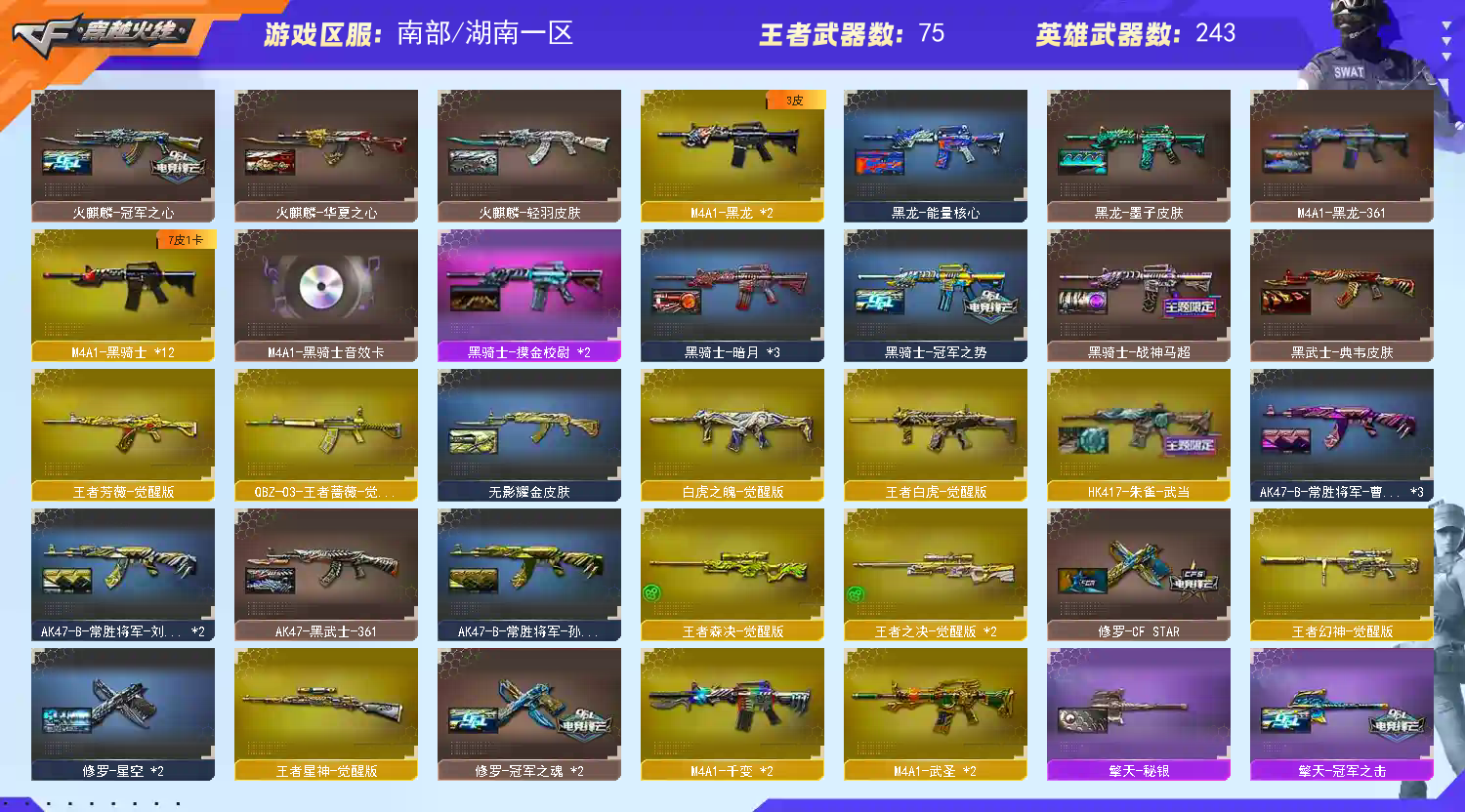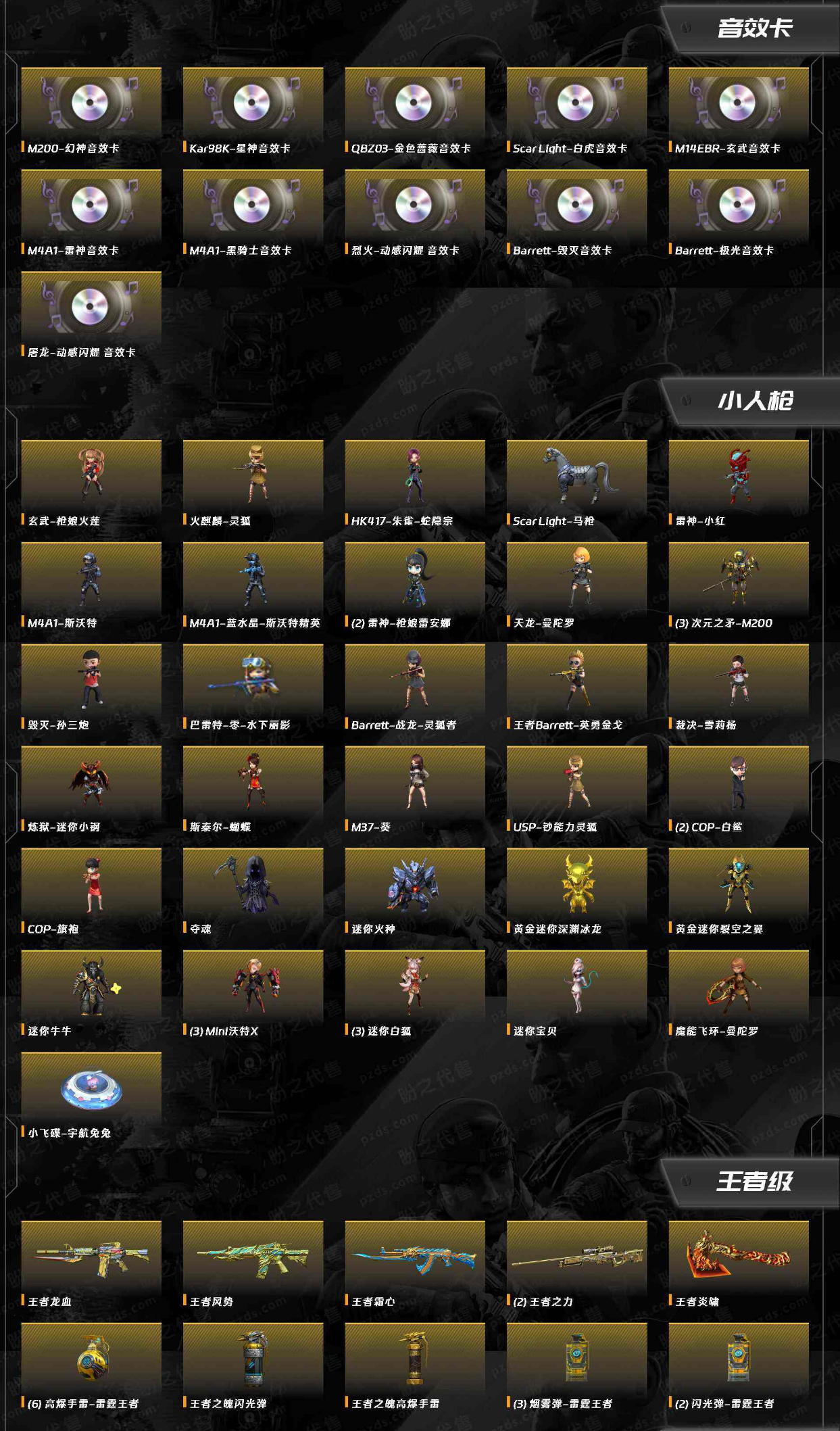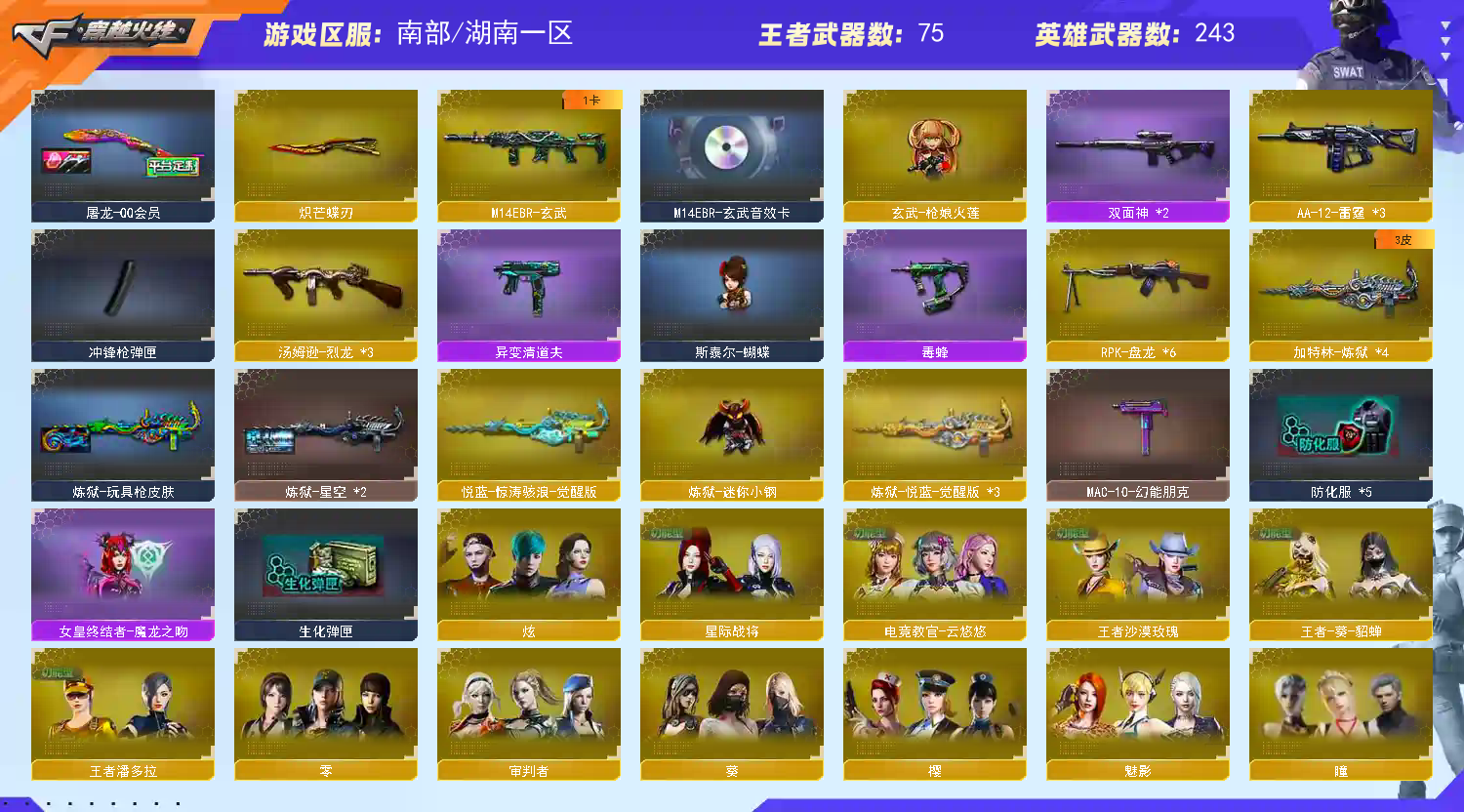 南部天花板♥300V♥7传说♥6幻神♥星神三件套♥白虎三件套♥蔷薇三件套♥死亡蝴蝶毒蜂♥手枪齐♥装备多皮肤多;柯尔特-冠军之特,炽芒蝶刃,Knife-冠军之刃,电竞教官-云悠悠,王者沙漠玫瑰,传说艾莉莎,RPK-盘龙,