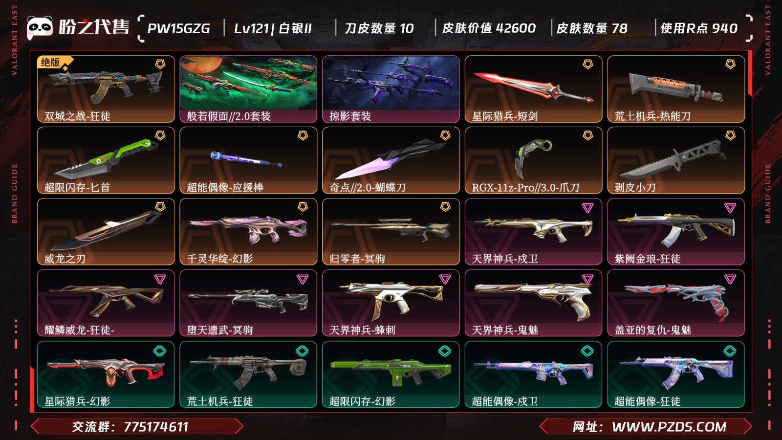 【皮肤资产价值】42600 【使用R点】940 【英雄数量】25 【皮肤数量】78 【卡面数量】87 【喷漆数量】87 【挂件数量】72 【拥有套装】般若假面2.0套装(般若假面//2.0-狂徒,般若假面//2.0-獠犬,般若假面//2.0-战神,般若假面//2.0-狂怒,鬼丸国纲)掠影套装(掠影-狂徒,掠影-冥驹,掠影-戍卫,掠影-正义,影刃) 【拥有近战武器】星际猎兵-短剑,荒土机兵-热能刀,超限闪存-匕首,超能偶像-应援棒,奇点//2.0-蝴蝶刀,RGX-11z-Pro//3.0-爪刀,剥皮小刀,威龙之刃, 【拥有步枪】双城之战-狂徒,千灵华绽-幻影,天界神兵-戍卫,紫阙金琅-狂徒,耀鳞威龙-狂徒-,星际猎兵-幻影,荒土机兵-狂徒,超限闪存-幻影,超能偶像-戍卫,超能偶像-狂徒,瑰梦艺语-狂徒,光环序列-戍卫,纳米-幻影,逆冲蛮牛-戍卫,逆冲蛮牛-獠犬,模拟赫兹-獠犬,浮光跃金-戍卫,采蜜小蜂队-獠犬,聚合之力-幻影, 【拥有狙击枪】归零者-冥驹,堕天遗武-冥驹,星际猎兵-飞将,荒土机兵-冥驹,超限闪存-莽侠,光环序列-冥驹,模拟赫兹-冥驹,聚合之力-飞将, 【拥有机枪】光环序列-战神,纳米-奥丁,浮光跃金-战神,采蜜小蜂队-战神, 【拥有冲锋枪】天界神兵-蜂刺,无限竞技-骇灵,荒土机兵-骇灵,超限闪存-蜂刺,瑰梦艺语-骇灵,浮光跃金-骇灵,聚合之力-蜂刺, 【拥有霰弹枪】星际猎兵-判官,超能偶像-判官,瑰梦艺语-雄鹿,逆冲蛮牛-雄鹿,纳米-判官,模拟赫兹-雄鹿,采蜜小蜂队-判官, 【拥有手枪】天界神兵-鬼魅,盖亚的复仇-鬼魅,幻心猎手-鬼魅,星际猎兵-标配,荒土机兵-标配,超限闪存-正义,超能偶像-标配,瑰梦艺语-鬼魅,光环序列-狂怒,纳米-正义,逆冲蛮牛-狂怒,模拟赫兹-鬼魅,浮光跃金-标配,聚合之力-狂怒,采蜜小蜂队-鬼魅, 【稀有挂件】无畏契约GO卷奇乐挂饰,V25第六幕铂金挂饰,第九季铂金挂饰,终章猫猫木乃伊挂饰,猫猫木乃伊挂饰,拳击战术熊挂饰,熔岩灯挂饰,无畏契约GO卷芮娜挂饰,无畏契约GO卷零挂饰,超能偶像挂饰,采蜜小蜂队挂饰,袖珍捷风挂饰,糖葫芦挂饰,迷你浓缩挂饰, 【卡面信息】万圣夜卡面,势不可挡捷风卡面,我见识过的恐惧卡面,分崩离析卡面,双城之战拥抱卡面,双城之战姐妹卡面,超能偶像卡面,;剥皮小刀,威龙之刃,掠影 戍卫,掠影 狂徒,紫阙金琅 狂徒,天界神兵 戍卫,天界神兵 蜂刺,