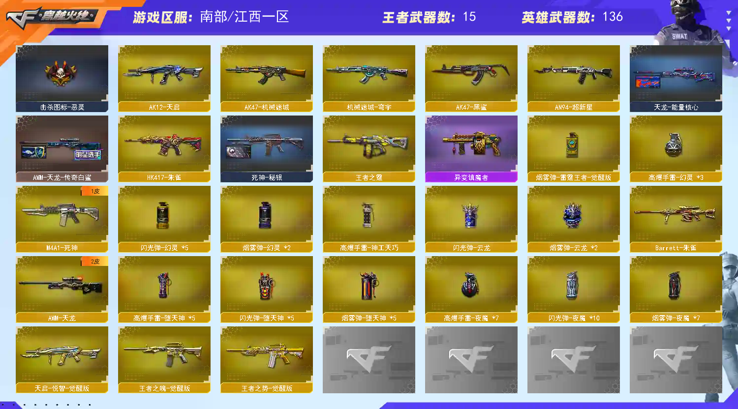 高品质排位号,满狙击音效卡,多种枪械皮肤供你选择,14发COP/20发usp火力输出,六盘六列生化不虚;柯尔特-荣耀世冠白鲨2023,炽芒蝶刃,RPK-盘龙,QBZ03-金色蔷薇,G36C-幻影,M200-幻神,Scar Light-白虎,