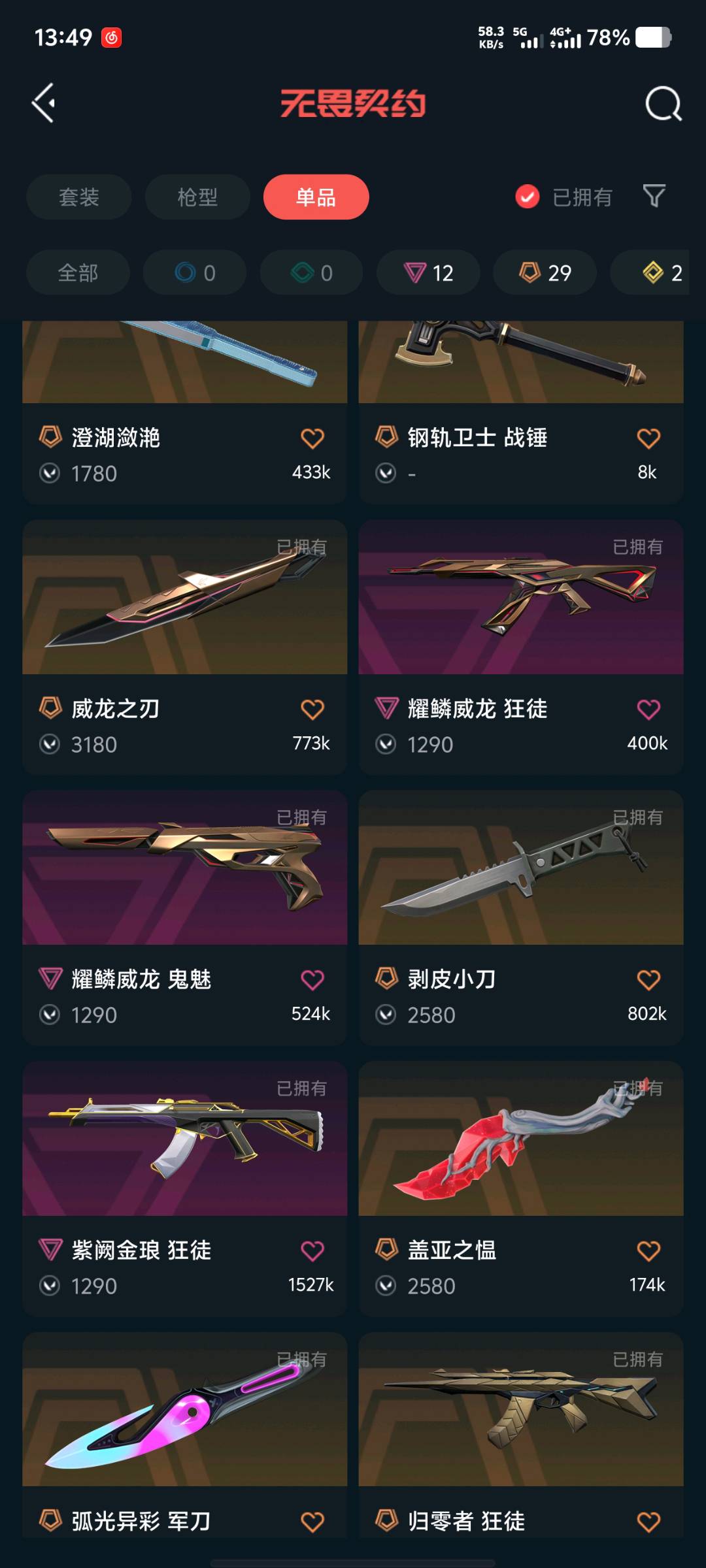 详细看商品图;紫金爪刀,剥皮小刀,威龙之刃,盖亚的复仇 狂徒,洪荒怒焰 狂徒,噬影者 狂徒,掠影 狂徒,