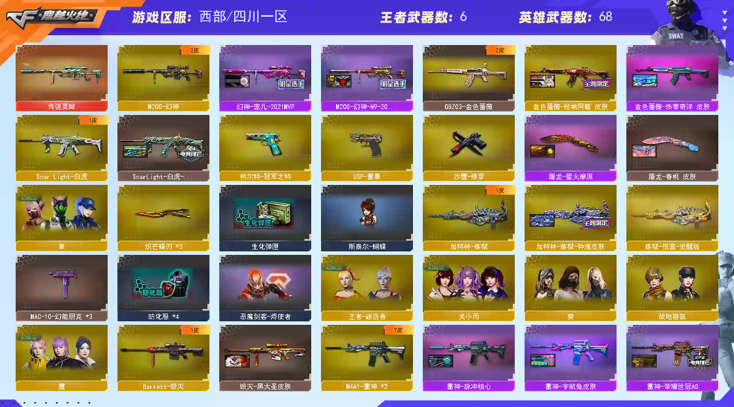 此账号和平台属于合作关系,已经备案。如果账号封号或者什么的,商户将会协助平台然后报警。 收藏好评!由于异地登录保护机制,部分客户在使用客户端自动上号时会出现密码错误,注意本号密码不会错误,请多尝试5-6次!本账号已经过虚拟财产-认1证。请素质租号,文明游戏,谢谢大家配合!!!;USP-雷暴,柯尔特-冠军之特,炽芒蝶刃,隼,QBZ03-金色蔷薇,M200-幻神,Scar Light-白虎,