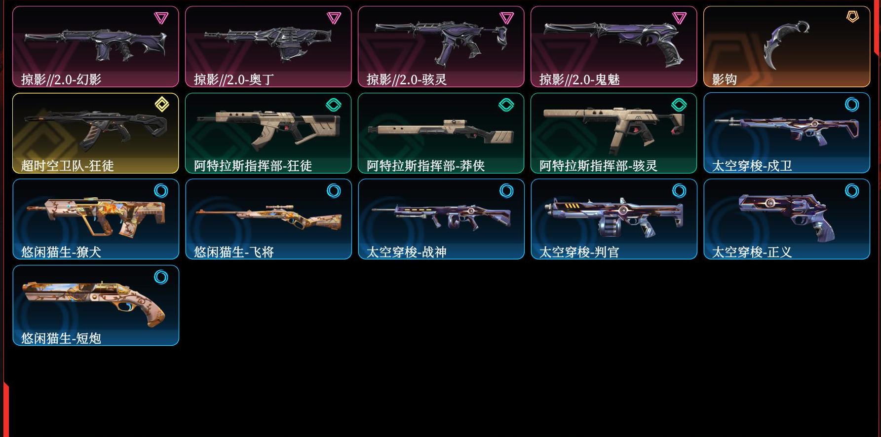 【拥有套装】掠影//2.0套装(掠影//2.0-幻影,掠影//2.0-奥丁,掠影//2.0-骇灵,掠影//2.0-鬼魅,影钩) 【拥有近战武器】 【拥有步枪】超时空卫队-狂徒,阿特拉斯指挥部-狂徒,太空穿梭-戍卫,悠闲猫生-獠犬, 【拥有狙击枪】阿特拉斯指挥部-莽侠,悠闲猫生-飞将, 【拥有机枪】太空穿梭-战神, 【拥有冲锋枪】阿特拉斯指挥部-骇灵, 【拥有霰弹枪】太空穿梭-判官, 【拥有手枪】太空穿梭-正义,悠闲猫生-短炮,;