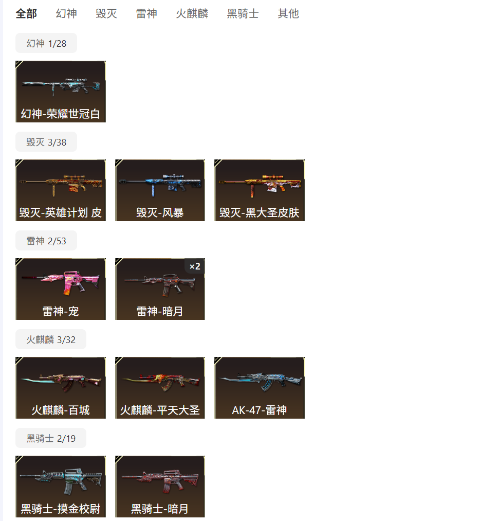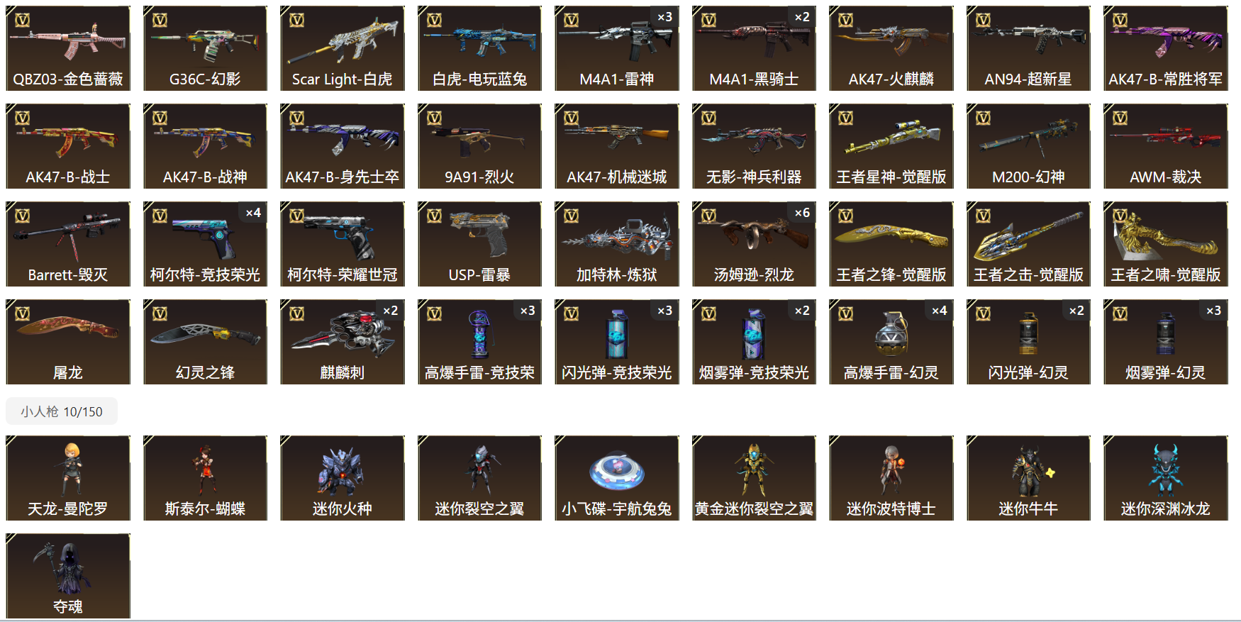63V,5王者,2炫金,传说暗裔/幻神荣耀世冠白鲨2023 /毁灭英雄计划 /毁灭风暴/毁灭黑大圣/火麒麟平天大圣/火麒麟百城/刘备/孙权/曹操/AK47雷神/鹰/电竞教官-云悠悠/荒漠琉璃/M200-幻神/Barrett-毁灭/王者星神-觉醒版/AWM-裁决/M4A1-雷神(3)/M200-幻神音效卡/M4A1-雷神音效卡/M4A1-黑骑士音效卡;USP-雷暴,柯尔特-荣耀世冠白鲨2023,电竞教官-云悠悠,QBZ03-金色蔷薇,G36C-幻影,M200-幻神,Scar Light-白虎,