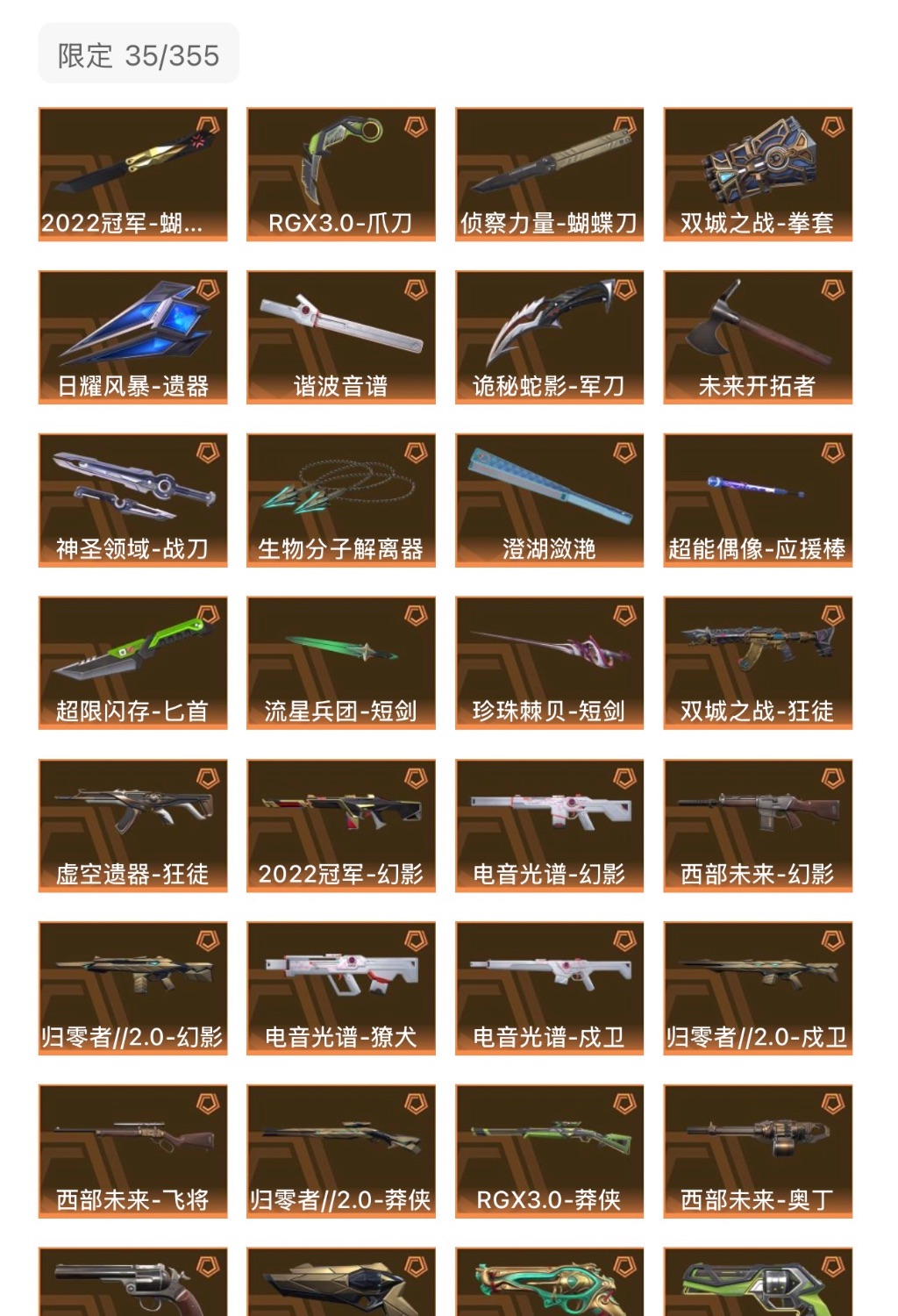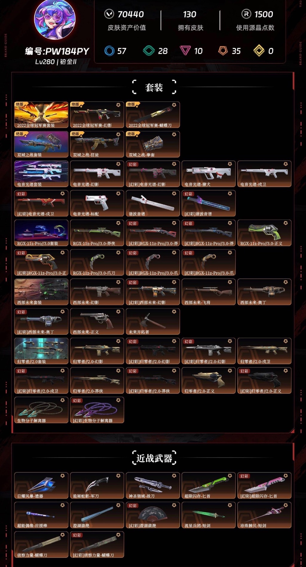 皮肤总价值70440/铂金II/总皮肤130/刀皮15枪皮115/传奇20卓越10/套装6/双城之战套装/RGX-11z-Pro//3.0套装/2022冠军套/电音光谱套/西部未来套/归零者2.0套/具体详情看图
