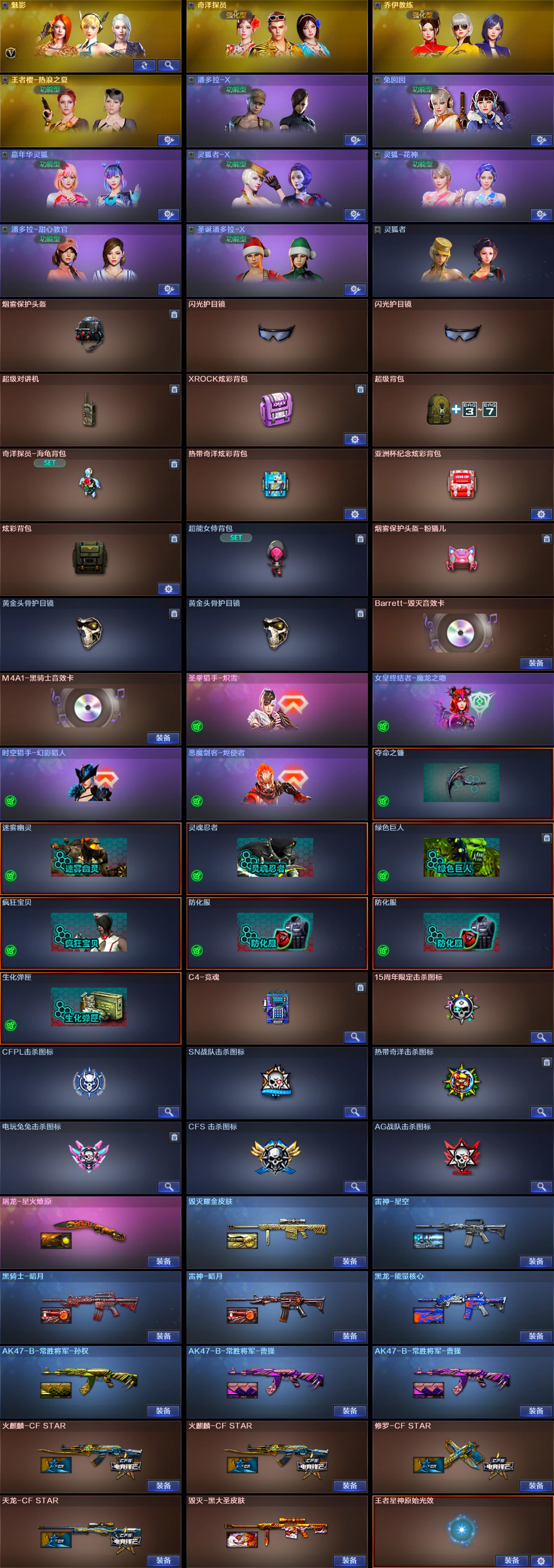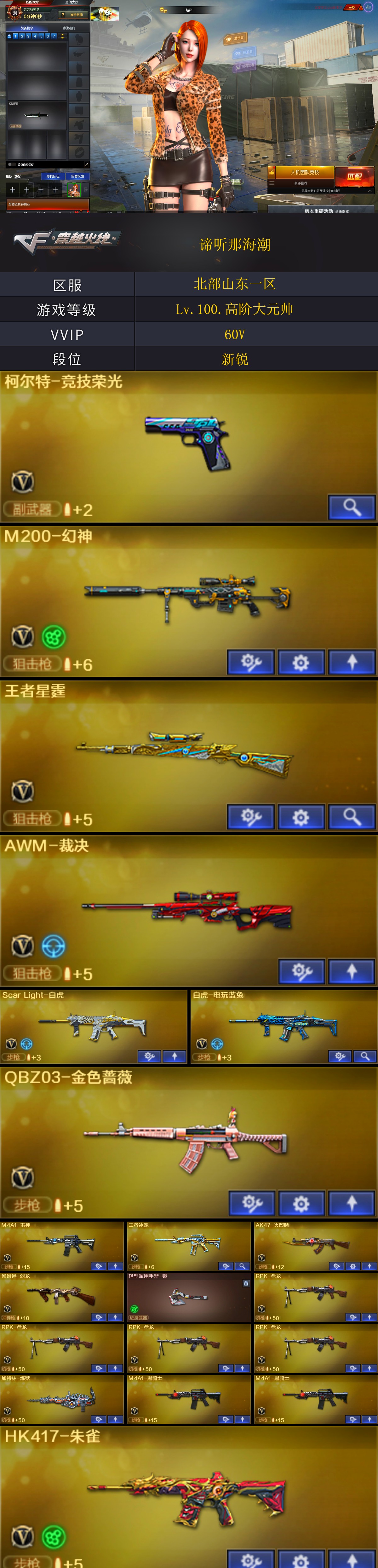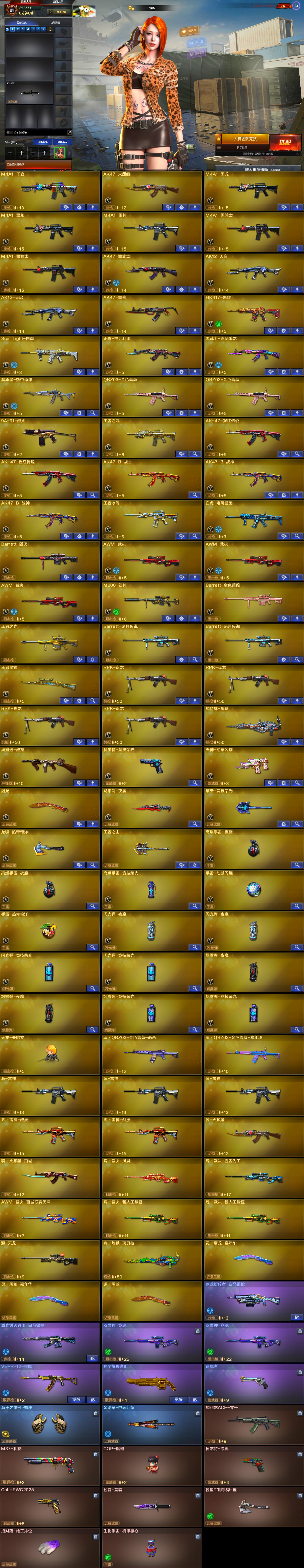 【稀有武器】:M200-幻神/ScarLight-白虎/HK417-朱雀/柯尔特-竞技荣光/天神-动感闪耀/QBZ03-金色蔷薇(2)/AK47-火麒麟/M4A1-黑龙(2)/M4A1-雷神/M4A1-黑骑士(2)/AK47-黑武士/白虎-电玩蓝兔/Barrett-毁灭/AWM-裁决(3)/RPK-盘龙(4)/加特林-炼狱/汤姆逊-烈龙/马来剑-夜魔/擎天-竞技荣光 【王者武器】:王者之光/王者星霆 【热门角色】:魅影/奇洋探员/乔伊教练/潘多拉-X/兔囡囡 【热门音效卡】:Barrett-毁灭音效卡/M4A1-黑骑士音效卡 【热门皮肤】:屠龙-星火燎原 【其他亮点】:VEPR-12-金魔/金刚伞-电玩红兔;RPK-盘龙,QBZ03-金色蔷薇,M200-幻神,Scar Light-白虎,