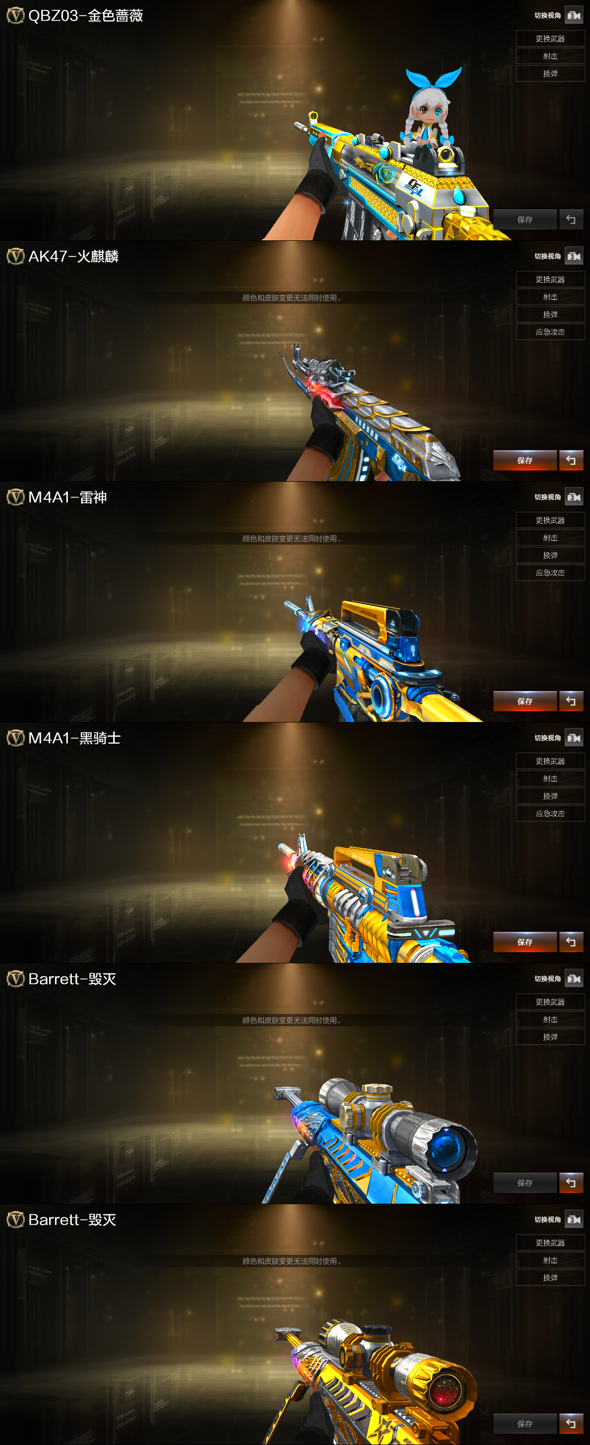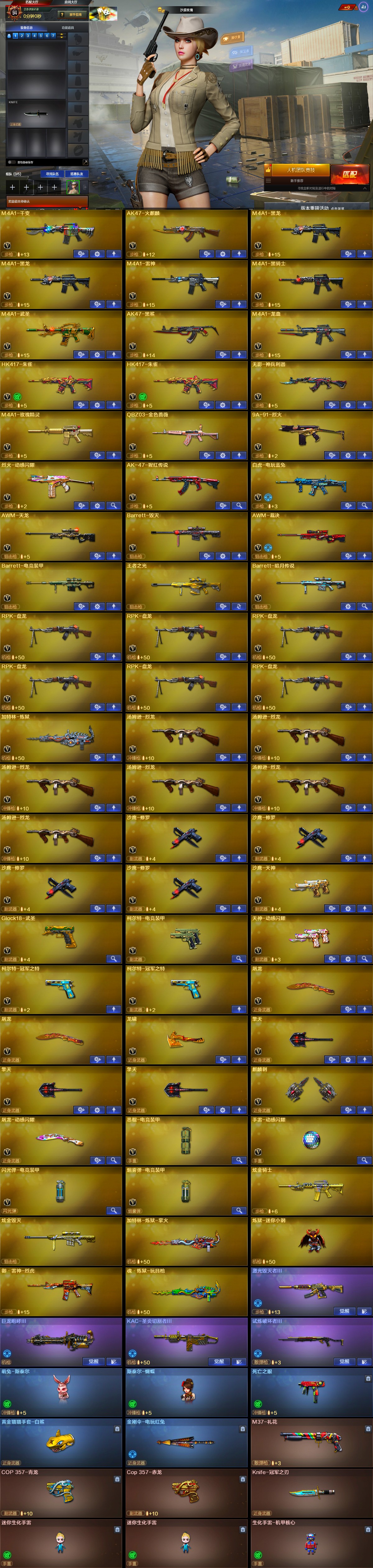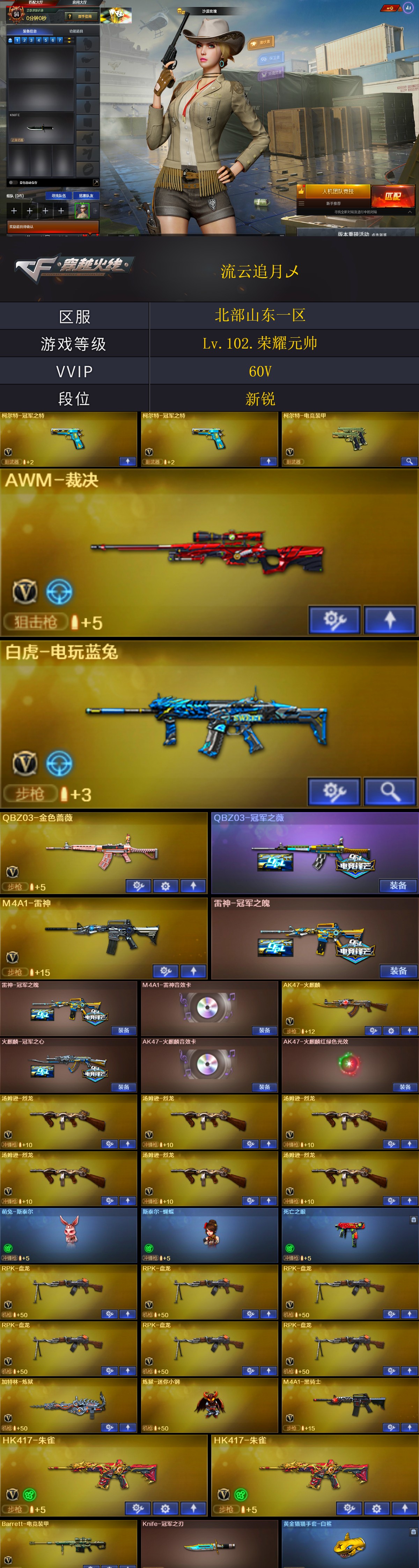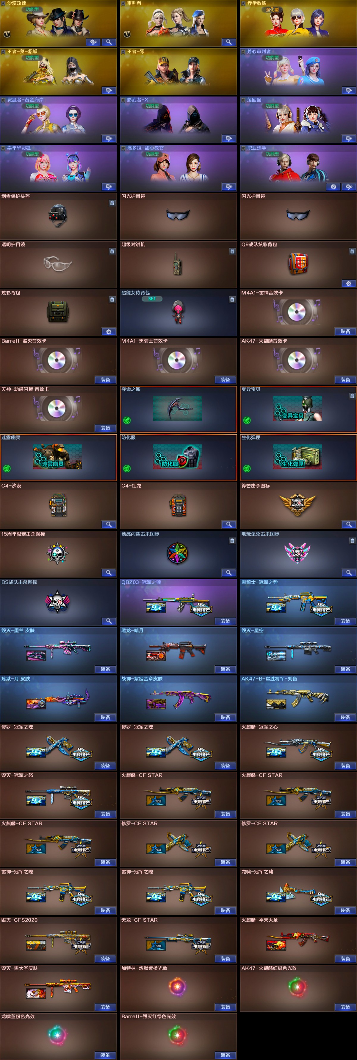 【稀有武器】:HK417-朱雀(2)/柯尔特-电竞装甲/天神-动感闪耀/柯尔特-冠军之特(2)/QBZ03-金色蔷薇/AK47-火麒麟/M4A1-黑龙(2)/M4A1-雷神/M4A1-黑骑士/白虎-电玩蓝兔/Barrett-毁灭/AWM-裁决/Barrett-电竞装甲/RPK-盘龙(6)/加特林-炼狱/汤姆逊-烈龙(6) 【王者武器】:王者之光 【热门角色】:沙漠玫瑰/乔伊教练/王者-葵-貂蝉/王者-零/兔囡囡/职业选手 【热门音效卡】:M4A1-雷神音效卡/Barrett-毁灭音效卡/M4A1-黑骑士音效卡/AK47-火麒麟音效卡 【热门皮肤】:QBZ03-冠军之薇/火麒麟-冠军之心/毁灭-冠军之怒/雷神-冠军之魄(2)/龙啸-冠军之啸/毁灭-CFS2020 【其他亮点】:斯泰尔-蝴蝶/炼狱-迷你小钢/Knife-冠军之刃/黄金猫猫手套-白鲨/金刚伞-电玩红兔;柯尔特-冠军之特,Knife-冠军之刃,沙漠玫瑰,RPK-盘龙,QBZ03-金色蔷薇,