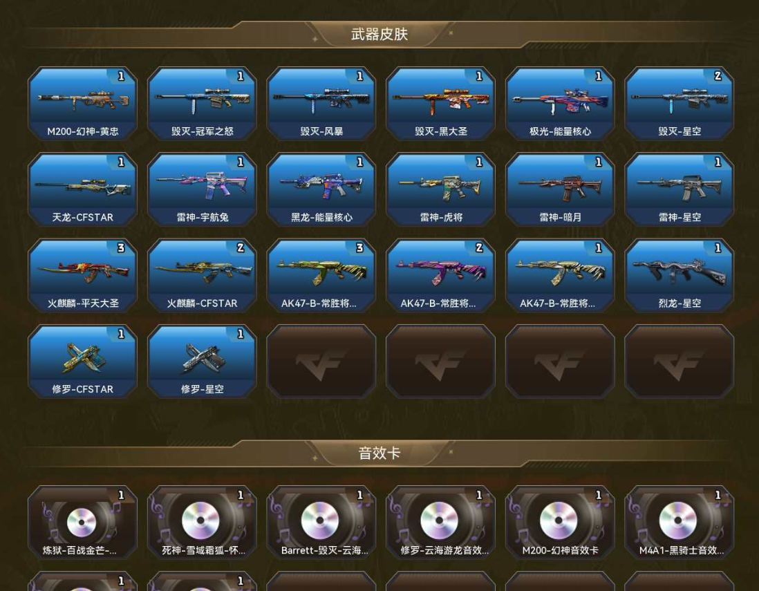 【幻影+6烈】【幻神AG-幻神电流骇客-幻神音效卡】【星神】86V,【稀有套装2】:竞技荣光套装/玄豹套装;【重要角色13】:电竞教官-云悠悠/玄豹/星际战将/隼/王者-魅影/葵-阿尔法武装/雪域霜狐/超能女侍/修道士/蜀雪/零-水下丽影/蛇隐宗/兰-限定版;【武器皮肤21】:幻神-AG-CFPLS24冠军/幻神-电流骇客/星神-枪娘默/毁灭-墨兰/天龙-CFSTAR/雷神-宇航兔/雷神-荣耀之魄/M4A1-雷神-白鲨