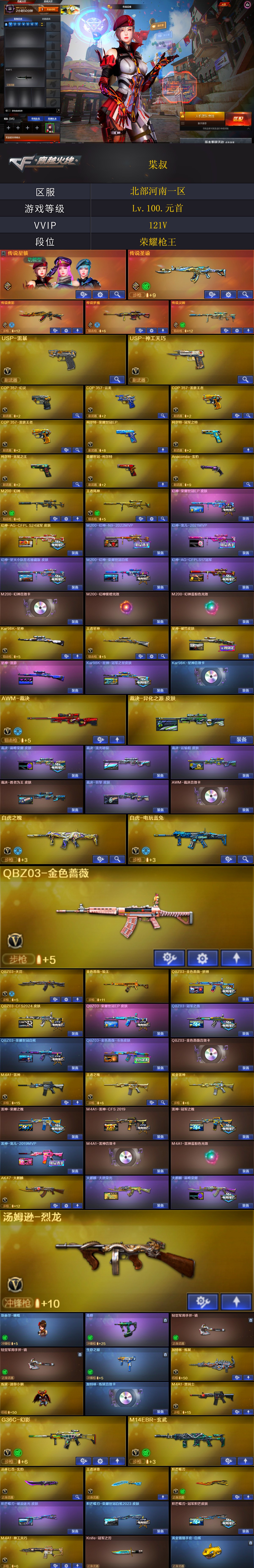 【商品标题】:北部河南一区-121V-可二次实名-【Lv.100.元首】-【段位:荣耀枪王】 【稀有武器】:传说夜影/传说梦魇/传说灵眸/M200-幻神/Kar98K-星神/G36C-幻影/M14EBR-玄武/QBZ03-天罚/M4A1-神工天巧/USP-雷暴/COP357-幻灵/USP-神工天巧/COP357-云龙/柯尔特-无冕之王/修罗-古蛇迷踪/荣耀世冠-柯尔特/COP357-雷霆王者-觉醒版(2)/柯尔特-冠军之特/金色蔷薇-古蛇迷踪/QBZ03-金色蔷薇/AK47-火麒麟/M4A1-雷神/M4A1-黑骑士/AK47-黑武士/白虎-电玩蓝兔/Barrett-毁灭/AWM-裁决/加特林-炼狱/汤姆逊-烈龙/炽芒蝶刃/斩神刀-雷暴/幻灵之锋/唐刀-神工天巧 【王者武器】:王者之魄-觉醒版/白虎之魄-觉醒版/王者星神-觉醒版/王者风神-觉醒版/王者玉锋(2) 【热门角色】:电竞教官-云悠悠/关小雨/华/谜/研/隐/隼/奇洋探员/乔伊教练/蛇隐宗/王者-迷迭香/王者凌霄/潘多拉-X/幽/职业选手 【热门音效卡】:M200-幻神音效卡/Kar98K-星神音效卡/AWM-裁决音效卡/QBZ03-金色蔷薇音效卡/加特林-炼狱音效卡/QBZ03-天罚音效卡/M4A1-雷神音效卡/Barrett-毁灭音效卡/M4A1-黑骑士音效卡 【热门皮肤】:幻神-AG-CFPLS24冠军皮肤/M200-幻神-N9-2022MVP/幻神-宠儿-2021MVP/幻神-星火小队签名臻藏版皮肤/M200-幻神-荣耀世冠白鲨/幻神-AG-CFPLS17冠军/裁决-巅峰荣耀皮肤/QBZ03-CFS2024皮肤/裁决-异化之源皮肤/星神-破竹皮肤/星神-漫游/屠龙-星火燎原/QBZ03-金色蔷薇-斗鱼皮肤/裁决-羽掣皮肤/Kar98K-星神-冠军之星皮肤/屠龙-荣耀世冠AG/火麒麟-巅峰荣耀/QBZ03-冠军之薇/炼狱-电子连击皮肤/裁决-流光秘银/黑龙-冠军之武/火麒麟-大唐荣光/炽芒蝶刃-破浪逐光皮肤/毁灭-直播专属/QBZ03-荣耀世冠白鲨/雷神-宠儿-2019MVP/炽芒蝶刃-荣耀世冠白鲨2023皮肤/黑骑士-AG-S4冠军典藏/M4A1-雷神-CFS2019/屠龙-荣耀之锋/毁灭-荣耀之怒/雷神-冠军之魄/炽芒蝶刃-冠军炽芒皮肤/雷神-荣耀之魄 【其他亮点】:斯泰尔-蝴蝶/炼狱-迷你小钢/Knife-冠军之刃/毒蜂/海神三叉戟(2)/黄金猫猫手套-白鲨/金刚伞-电玩红兔/烟雾弹-荣耀世冠白鲨2023 (截图展示段位不代表实际段位,如赛季更新等不可抗拒因素发生变化,其余道具看截图或咨询客服);USP-雷暴,柯尔特-无冕之王,荣耀世冠-柯尔特,柯尔特-冠军之特,炽芒蝶刃,Knife-冠军之刃,传说星骇,