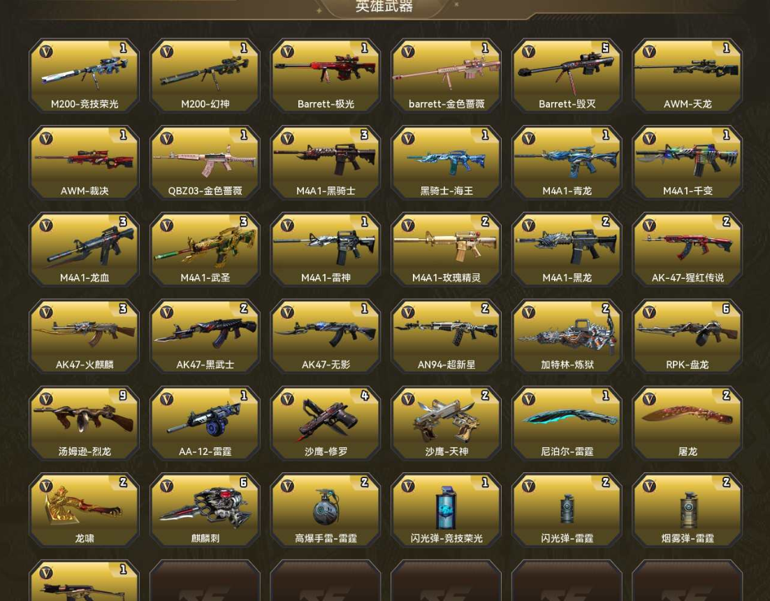 【6盘+9烈+斯泰尔蝴蝶+幻神音效卡】【传说光耀】84V【重要角色7】:樱/王者沙漠玫瑰/王者-瞳-闭月羞花/灵狐者-黄金海岸/铁骑荣耀/蜀雪/炽天使;【武器皮肤8】:毁灭-星空/毁灭耀金/M4A1-千变-孔明/雷神-星空/火麒麟-平天大圣/天启-暗月/火麒麟-AG/AK-47-雷神;【英雄武器82】:M200-竞技荣光/M200-幻神/Barrett-极光/barrett-金色蔷薇/Ba