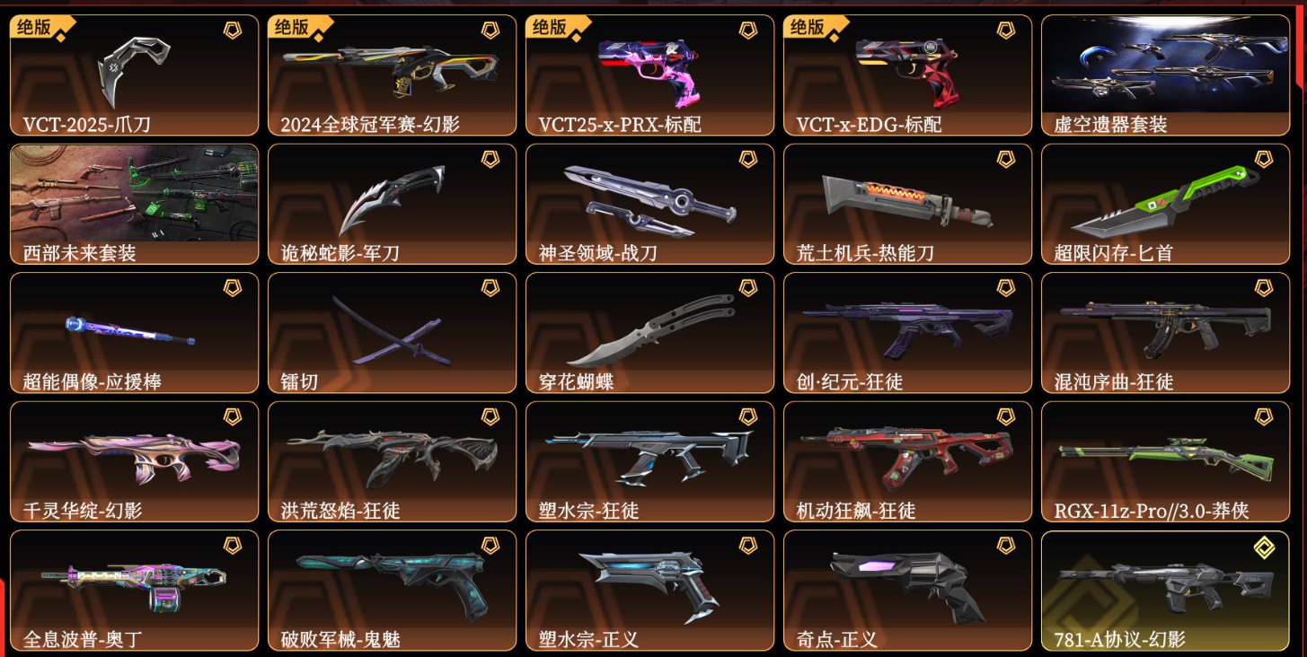 10刀★98枪皮★虚空遗器套★西部未来套★24冠军幻影★混沌狂徒★塑水狂徒★镭切★VCT2025爪刀