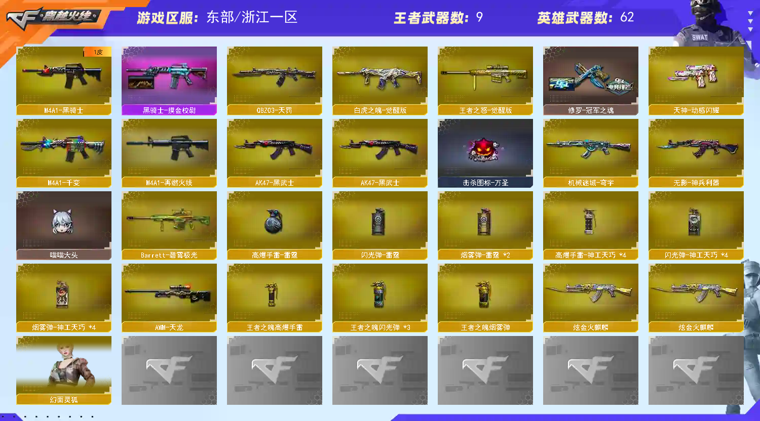 【M200幻神+幻神荣耀世冠EP】【柯尔特百战金芒+冠军之特】【星神】【觉醒白虎之魄】【朱雀电竞之星】【天罚】【4烈龙+双面神竞魂+黑龙吞噬者】【冠军之刃】【金色蔷薇+QBZ冠军之薇】【毁灭直播专属+毁灭青帝+雷神冠军之魄+火麒麟冠军之心+毁灭冠军之怒】【炼狱百战金芒庆典舞曲音效卡+朱雀电竞之星竞星跃动音效卡+屠龙电竞之星竞星跃动音效卡+碧霄极光音效卡+屠龙动感闪耀音效卡】【满配幻面灵狐+满配阿尔法武装+奇洋探员+满配乔伊教练+四防王者涂鸦+四防暗夜审判+四防女主播+传情小小语音包+鹿小町语音包+职业选手】【火麒麟+雷神+黑骑士+毁灭】【火麒麟零纪元+水枪不败狙神+炼狱迷你小钢+cop旗袍】【黄金猫猫手套+金刚伞】【猫猫手套】;柯尔特-冠军之特,Knife-冠军之刃,QBZ03-金色蔷薇,M200-幻神,Kar98K-星神,