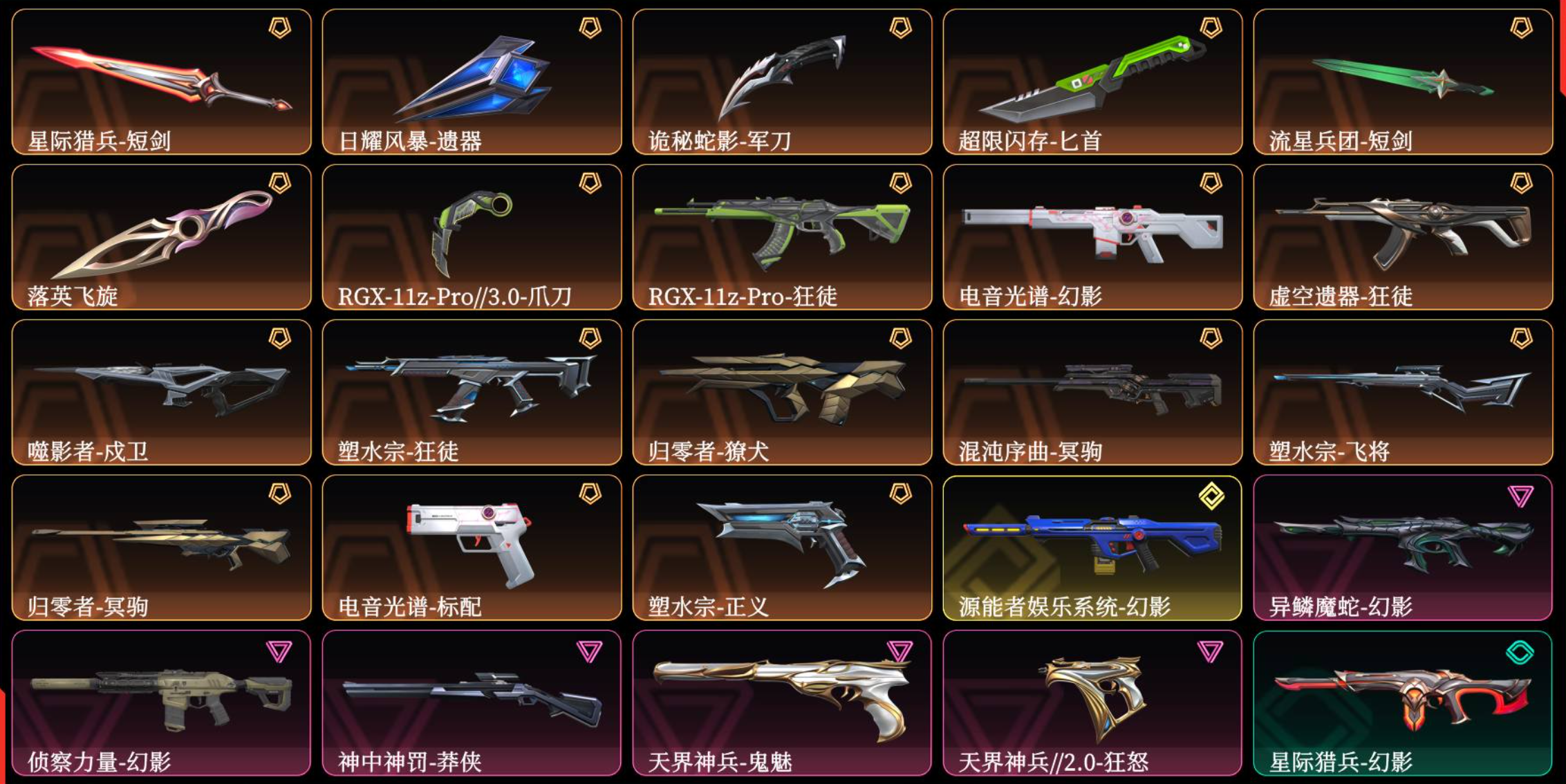 7刀皮★91枪皮★塑水宗狂徒★显卡狂徒★归零者冥狙★混沌序曲冥狙★落英飞旋★显卡爪刀★诡秘蛇影军刀