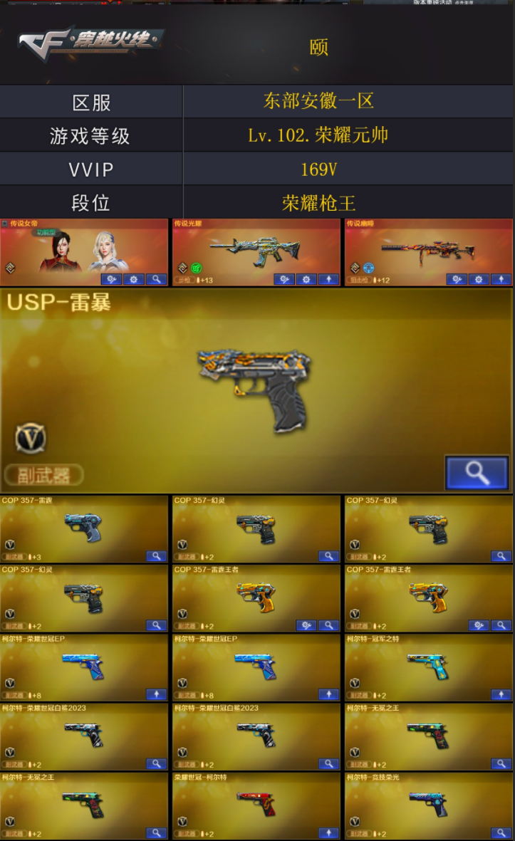 【商品标题】:东部安徽一区-169V-可二次实名-【Lv.102.荣耀元帅】-【段位:荣耀枪王】 【稀有武器】:传说光耀/传说幽瞳/M200-幻神/Kar98K-星神/G36C-幻影/ScarLight-白虎/HK417-朱雀/M4A1-幻灵/雷霆之契/USP-雷暴/COP357-幻灵(3)/柯尔特-竞技荣光/天神-动感闪耀/柯尔特-荣耀世冠白鲨2023(2)/柯尔特-无冕之王(2)/荣耀世冠-柯尔特/COP357-雷霆王者-觉醒版(2)/柯尔特-冠军之特/QBZ03-金色蔷薇/AK47-火麒麟(2)/M4A1-黑龙(2)/M4A1-雷神(6)/M4A1-黑骑士/AK47-无影/荣耀世冠-火麒麟/荣耀世冠-雷神/白虎-电玩蓝兔/Barrett-毁灭(2)/Barrett-极光/AWM-裁决/M200-竞技荣光/RPK-盘龙/炼狱-风暴/汤姆逊-烈龙(6)/AA-12-雷霆/炽芒蝶刃/斩神刀-雷暴/幻灵之锋(2)/擎天-竞技荣光 【王者武器】:王者白虎-觉醒版/王者幻神-觉醒版 【热门角色】:传说女帝/电竞教官-云悠悠/晴雅/影豹/雨棠/乔伊教练/王者-葵-貂蝉/王者玲珑/王者晴雅/空/灵狐者-职业经理/潘多拉-X/兔囡囡/幽/潘多拉 【热门音效卡】:M200-幻神音效卡/Kar98K-星神音效卡/Barrett-毁灭音效卡/M4A1-黑骑士音效卡 【热门皮肤】:幻神-传奇70KG/幻神-荣耀世冠白鲨2023皮肤/幻神-宠儿-2021MVP/幻神-星火小队签名臻藏版皮肤/M200-幻神-荣耀世冠白鲨/幻神-冠军之幻/幻神-电流骇客皮肤/白虎-白鲨-CFPLS23冠军/裁决-巅峰荣耀皮肤/QBZ03-CFS2024皮肤/金色蔷薇-破浪逐光皮肤/屠龙-星耀皮肤/毁灭-星耀皮肤/屠龙-星火燎原/雷神-R.LGD-CFPLS18冠军/星神-巅峰荣耀 皮肤/白虎-巅峰荣耀 皮肤/屠龙-破浪逐光皮肤/白虎-AG-CFPLS20冠军/黑龙-冠军之武/炽芒蝶刃-破浪逐光皮肤/QBZ03-AG-CFPLS19冠军/QBZ03-荣耀世冠白鲨(2)/AK47-火麒麟-传奇EVEN/炽芒蝶刃-荣耀世冠白鲨2023皮肤/ScarLight-白虎-冠军之虎皮肤/M4A1-雷神-CFS2019/屠龙-荣耀之锋/毁灭-荣耀之怒/雷神-冠军之魄/炽芒蝶刃-冠军炽芒皮肤/雷神-荣耀之魄(2) 【其他亮点】:白虎-枪娘安妮/Scar Light-马枪/贝雷塔687-射手座/烟雾弹-荣耀世冠白鲨2023(4) (截图展示段位不代表实际段位,如赛季更新等不可抗拒因素发生变化,其余道具看截图或咨询客服);USP-雷暴,柯尔特-无冕之王,USP-雷暴王者,荣耀世冠-柯尔特,柯尔特-荣耀世冠白鲨2023,柯尔特-冠军之特,炽芒蝶刃,