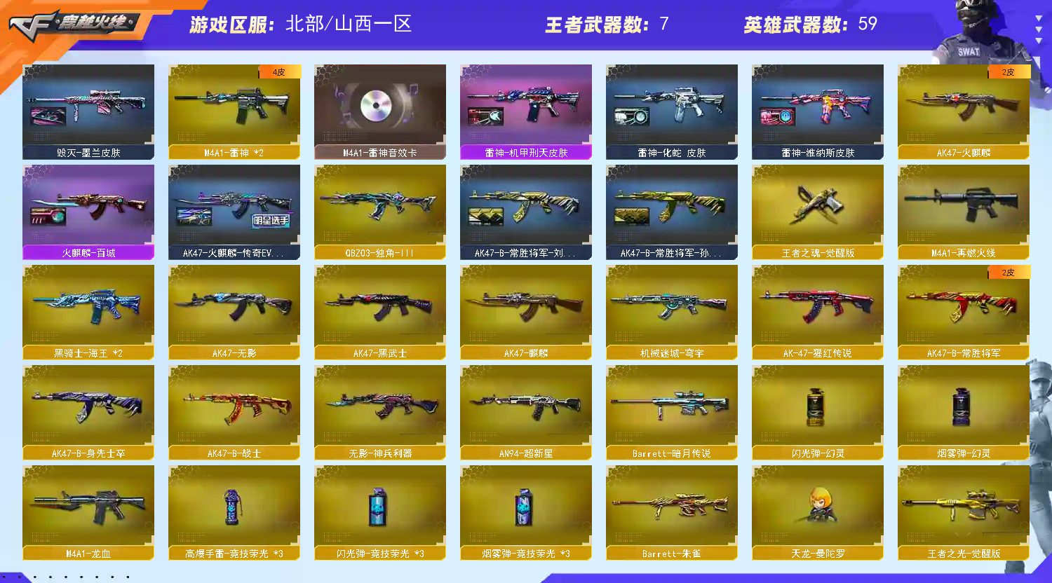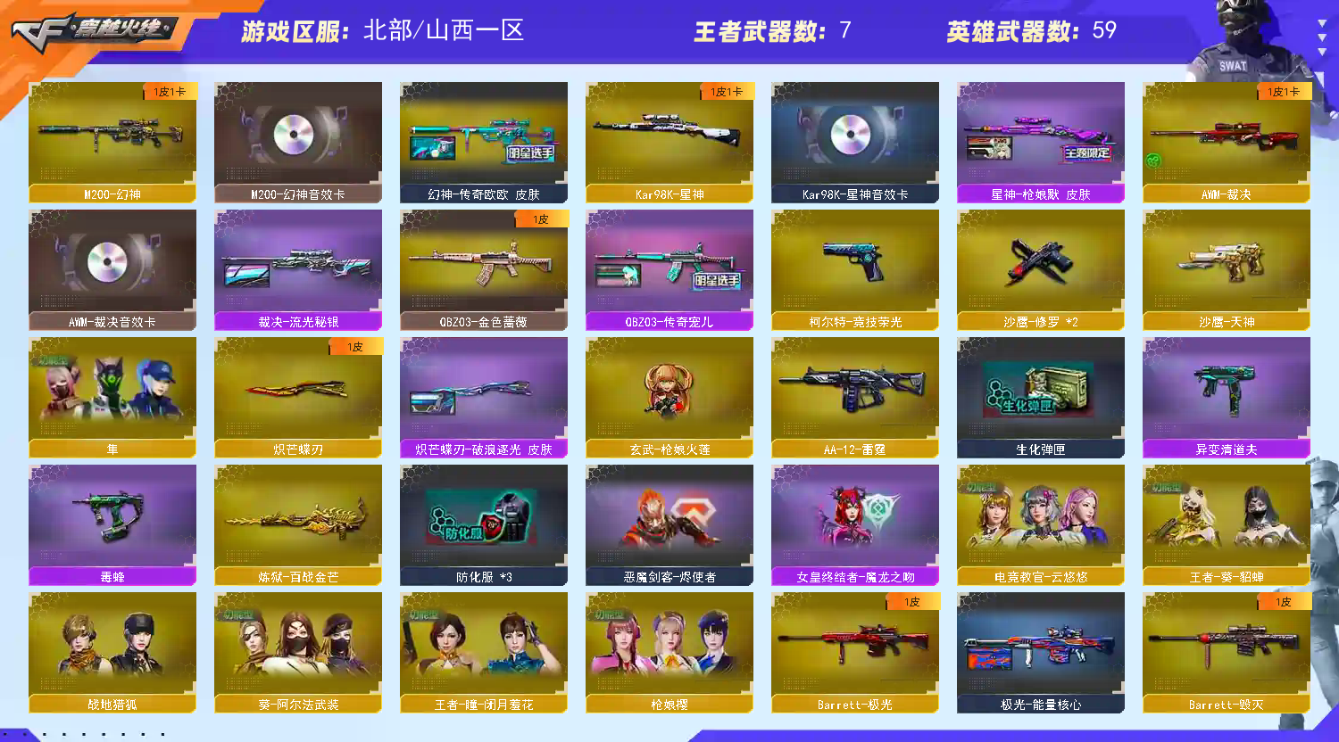 【北.部】天花板♥幻神欧欧三件套♥星神三件套♥裁决三件套♥qbz传奇宠儿♥蝴蝶刀带皮隼毒蜂异变清道夫;炽芒蝶刃,隼,电竞教官-云悠悠,QBZ03-金色蔷薇,M200-幻神,Kar98K-星神,