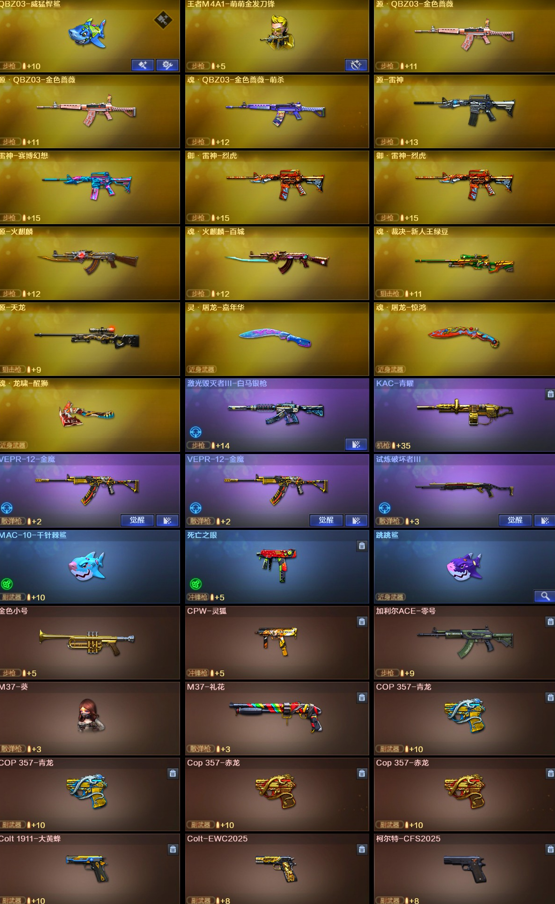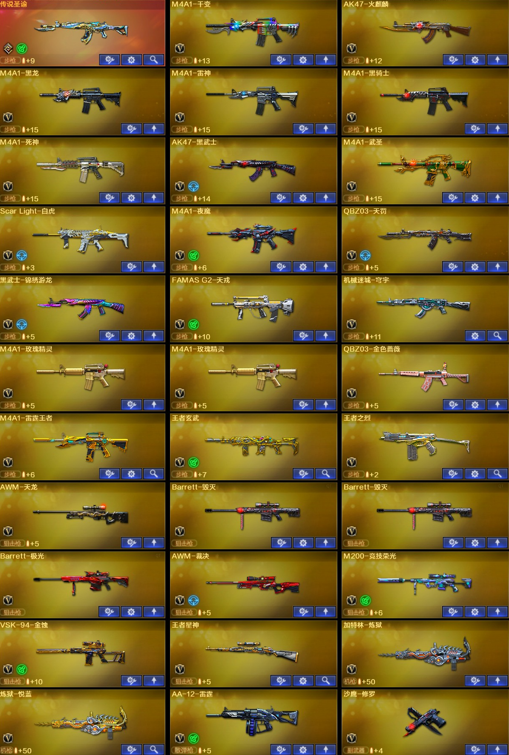 【稀有武器】:VSK-94-金蚀/ScarLight-白虎/QBZ03-天罚/M4A1-夜魔/USP-雷暴/COP-堕天神(2)/破空枪刃-夜魔/柯尔特-竞技荣光/COP357-雷霆王者-觉醒版/QBZ03-金色蔷薇/AK47-火麒麟/M4A1-黑龙/M4A1-雷神/M4A1-黑骑士/AK47-黑武士/Barrett-毁灭(2)/Barrett-极光/AWM-裁决/M200-竞技荣光/加特林-炼狱/AA-12-雷霆/马来剑-夜魔/擎天-竞技荣光 【王者武器】:M4A1-雷霆王者-觉醒版/王者星神-觉醒版 【热门角色】:凌霄/王者炫 【热门音效卡】:AWM-裁决音效卡/Barrett-毁灭音效卡 【热门皮肤】:ScarLight-白虎-暗星/屠龙-荣耀之锋/毁灭-荣耀之怒 【其他亮点】:VEPR-12-金魔(2);USP-雷暴,QBZ03-金色蔷薇,Scar Light-白虎,传说圣谕,