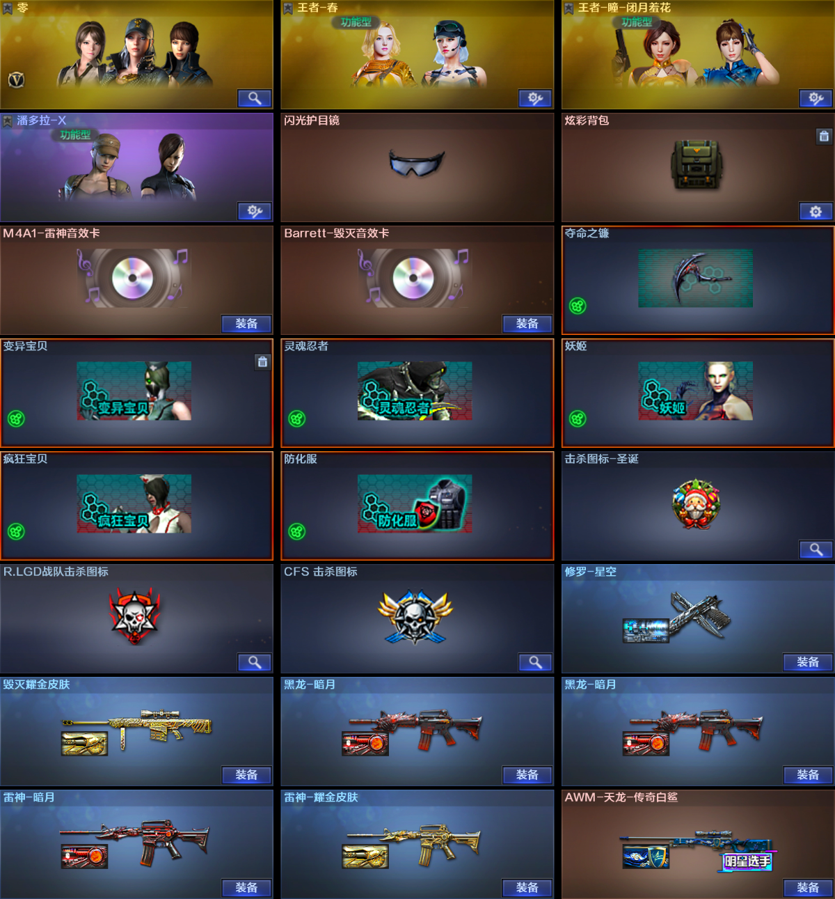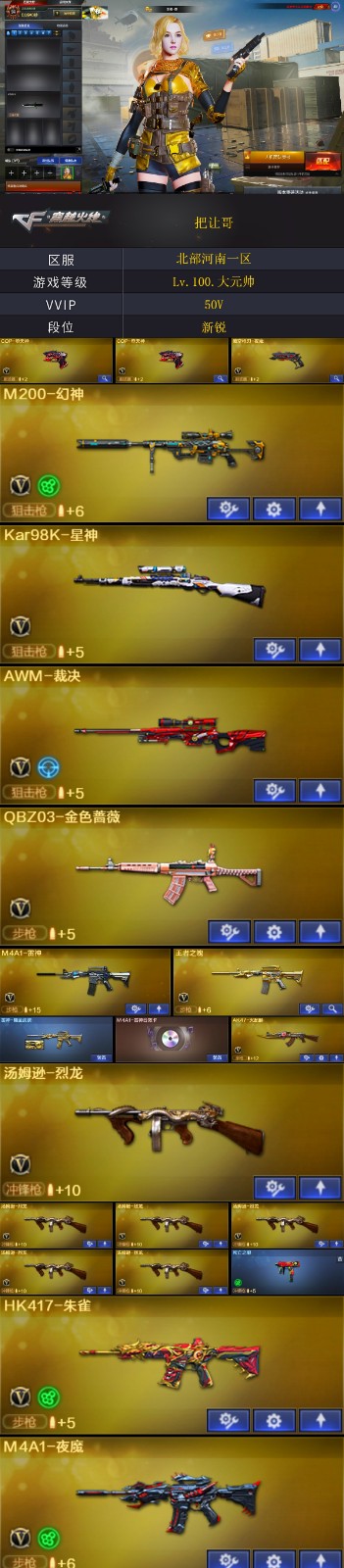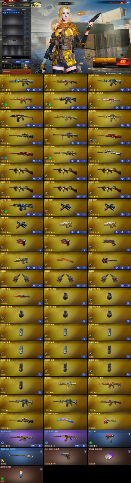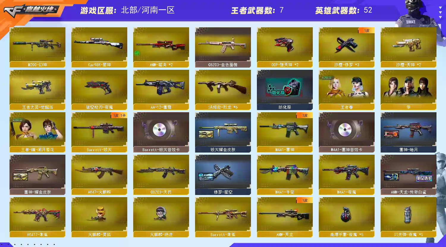 【稀有武器】:M200-幻神/Kar98K-星神/HK417-朱雀/M4A1-夜魔/COP-堕天神(2)/破空枪刃-夜魔/QBZ03-金色蔷薇/AK47-火麒麟/M4A1-雷神/Barrett-毁灭/AWM-裁决(2)/汤姆逊-烈龙(6)/AA-12-雷霆/马来剑-夜魔 【王者武器】:王者之魄-觉醒版 【热门角色】:王者春/潘多拉-X 【热门音效卡】:M4A1-雷神音效卡/Barrett-毁灭音效卡 【其他亮点】:VEPR-12-金魔/贝雷塔687-射手座;炽芒蝶刃,QBZ03-金色蔷薇,M200-幻神,Kar98K-星神,