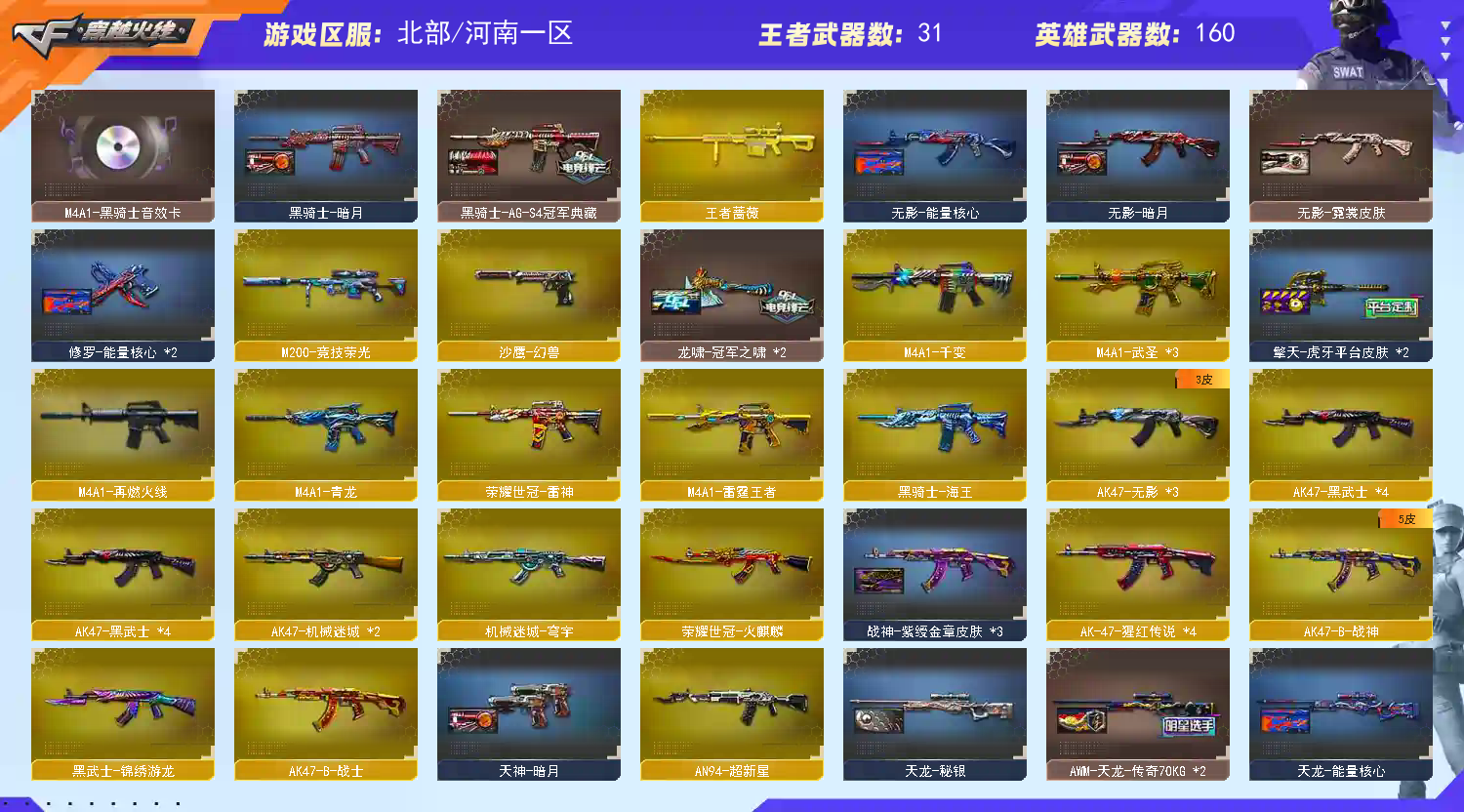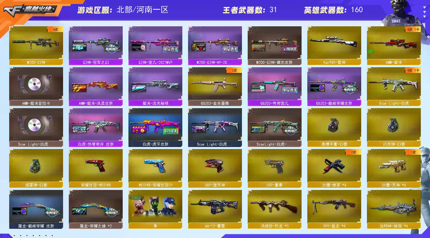 【北部绝版幻兽套180V幻神四皮裁决双皮三件套白虎四皮三件套QBZ双皮荣耀世冠EP柯尔特双冠军之刃】 北部 河南一区 四字ID:本以为爱 🔎幻神宠儿/N9/冠军之幻/黄忠 星神 裁决流光秘银/凤灵 +裁决音效卡 QBZ金色蔷薇传奇宠儿/巅峰荣耀 白虎冠军之虎/巅峰荣耀/虎牙/热带奇洋+白虎音效卡 毁灭荣耀之怒/BEAN2020MVP/CFS2018+毁灭音效卡 火麒麟横秒之巅+火麒麟音效卡 雷神荣耀之魄/宠儿/N9/CFS2019+雷神音效卡 黑骑士AGS4冠军+黑骑士音效卡 黑龙冠军之武 🔎绝版幻兽套 USP雷暴 COP堕天神 荣耀世冠柯尔特 荣耀世冠EP柯尔特 屠龙荣耀之锋/巅峰荣耀 龙啸冠军之啸 擎天虎牙 冠军之刃×2 🔎雨棠 隼 王者迷迭香 职业选手 炫彩背包×7;USP-雷暴,荣耀世冠-柯尔特,Knife-冠军之刃,隼,RPK-盘龙,QBZ03-金色蔷薇,M200-幻神,