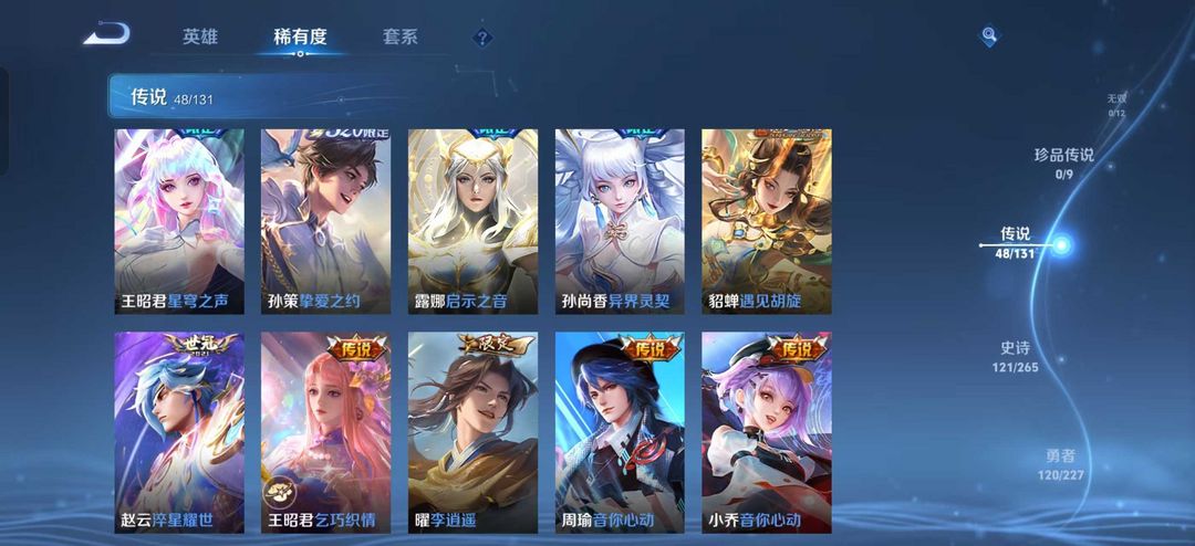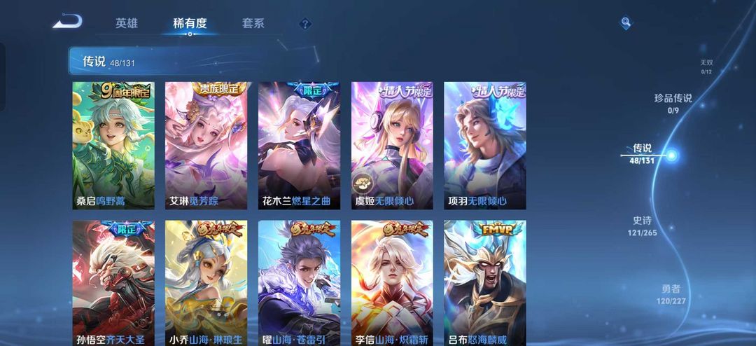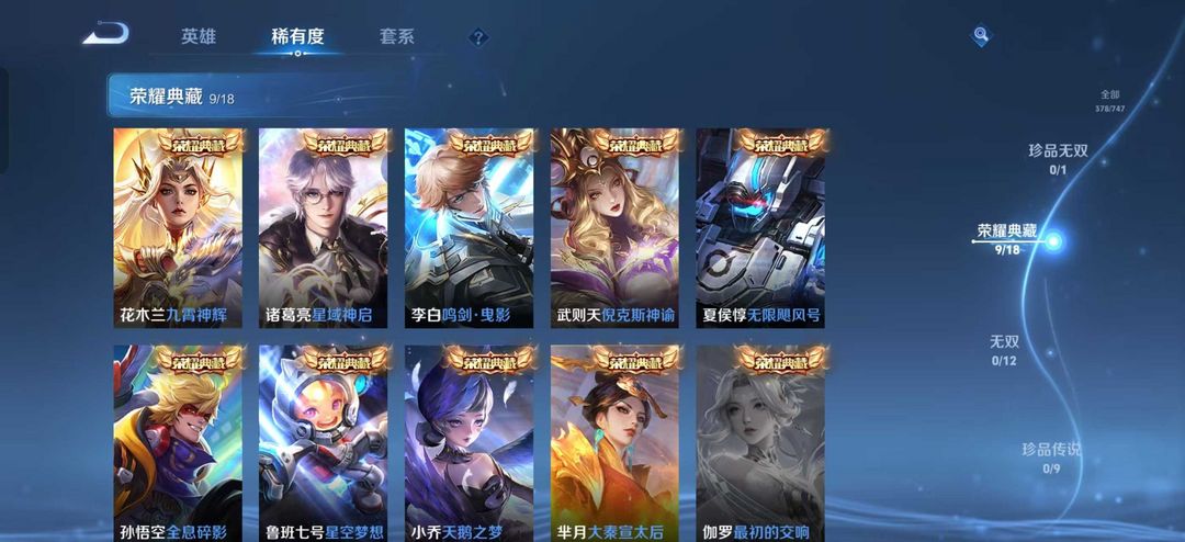 v10、537皮6水4无双、安琪拉-颠倒童话·魔镜、朵莉亚-神骥、遇见神鼓、齐天大圣、白虎志、韩信荣耀典藏、73传说、时之魔女、瑶无双、青丘、九尾、神器明辉仪