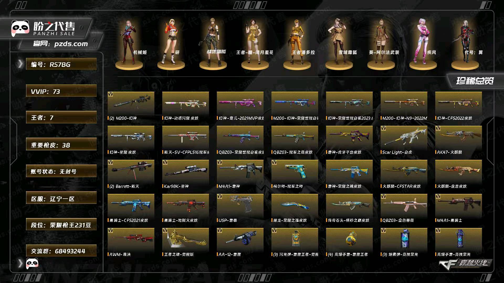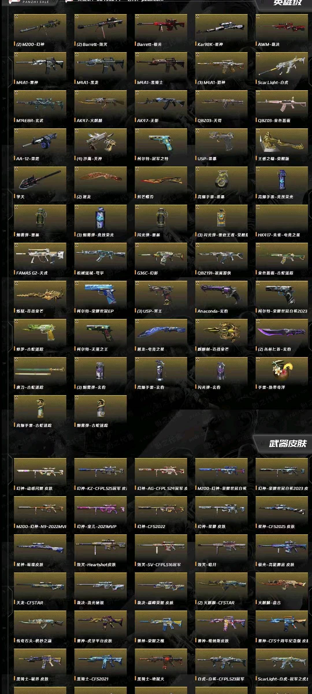 【荣耀枪王231豆】【Lv.102 荣耀元帅】VIP5 73V,7王者,幻神动感闪耀 /幻神KZCFPLS25冠军 /幻神AGCFPL S24冠军 /幻神世冠白鲨/幻神荣耀世冠白鲨2023 /幻神N9/幻神宠儿/幻神CFS2022/幻神星耀 /星神CFS2025 /机械姬/研/战地猎狐/幻面灵狐/M200-幻神(2)/Barrett-毁灭(2)/Barrett-极光/Kar98K-星神/AWM-裁决/M200-幻神音效卡/Kar98K-星神音效卡/星神-古蛇迷踪音效卡/Scar Light-白虎音效卡/M4A1-黑骑士音效卡/死神-雪域霜狐-怀旧音效卡/AWM-裁决音效卡/Barrett-极光音效卡/Barrett-碧霄极光音效卡/炼狱-百战金芒-庆典舞曲音效卡;USP-雷暴,柯尔特-无冕之王,柯尔特-荣耀世冠白鲨2023,柯尔特-冠军之特,炽芒蝶刃,QBZ03-金色蔷薇,G36C-幻影,