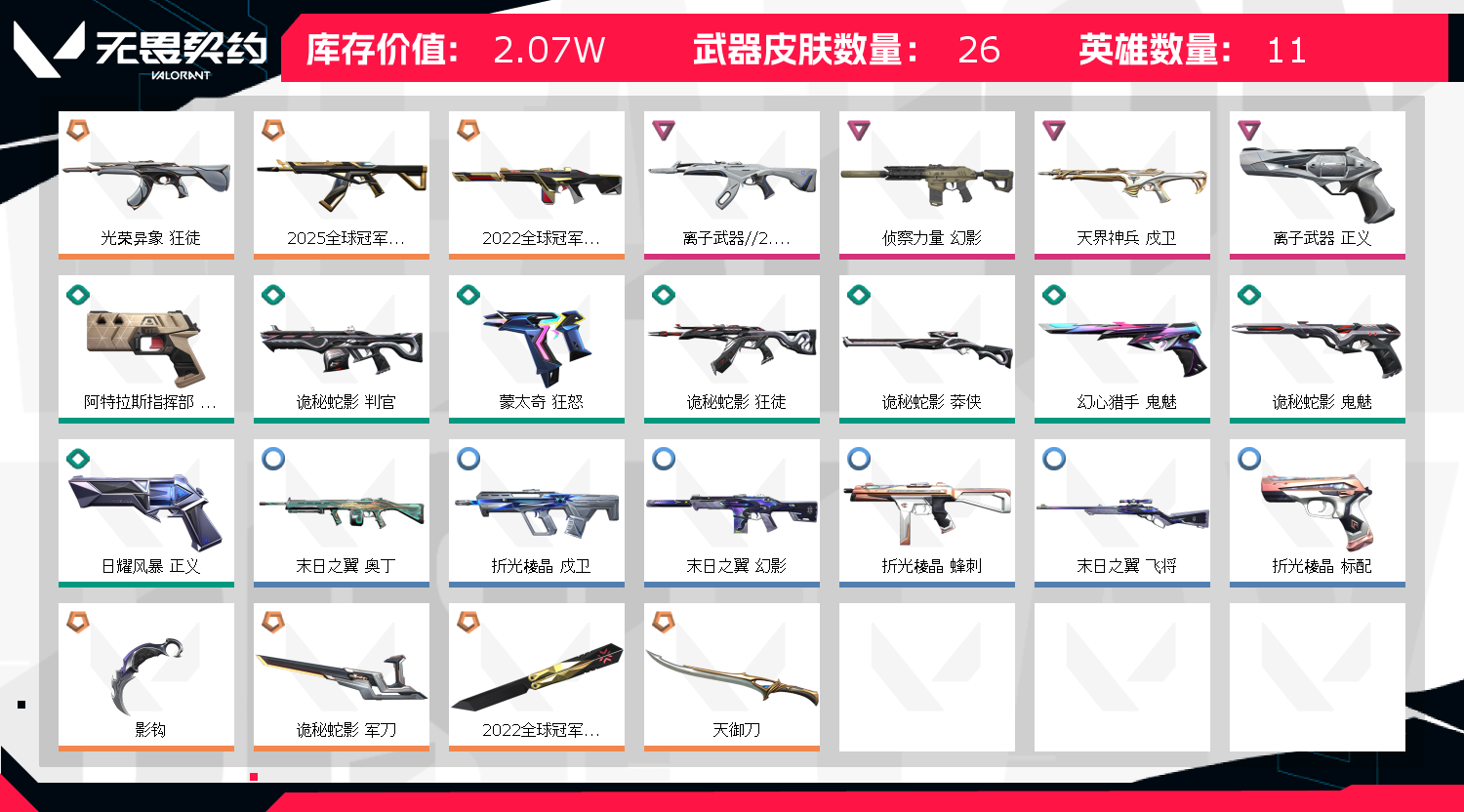 2万资产25冠军狂徒22冠军套影钩天界神兵侦察力量离子武器子武器//2.0 狂徒诡秘蛇影 军刀;侦察力量 幻影,天界神兵 戍卫,光荣异象 狂徒,离子武器//2.0 狂徒,离子武器 正义,