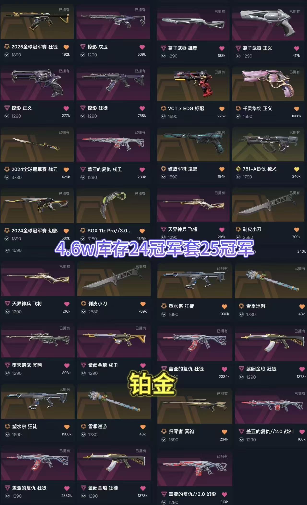 冻结秒解⚡5w库存24+25冠军套⚡ak:塑水+盖亚+紫金+掠影⚡剥皮+显卡爪⚡幻影:盖亚 堕天狙;剥皮小刀,盖亚的复仇 狂徒,掠影 戍卫,掠影 狂徒,紫阙金琅 狂徒,塑水宗 狂徒,2024全球冠军赛 幻影,