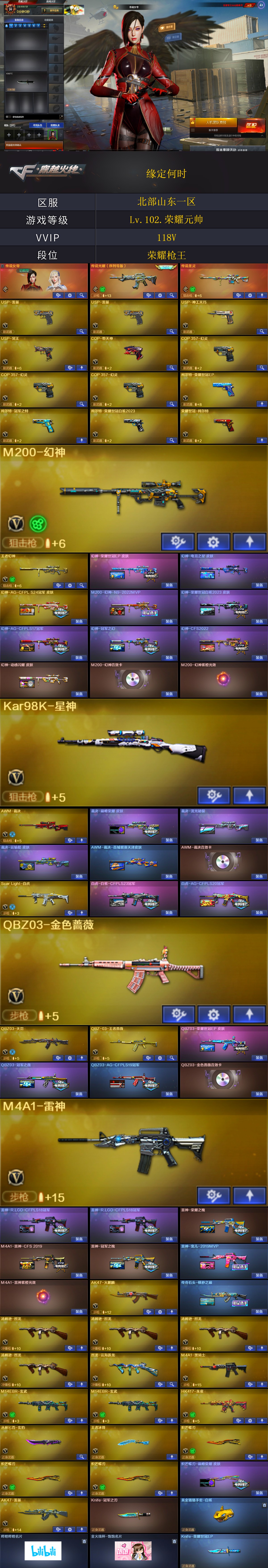 【商品标题】:北部山东一区-118V-可二次实名-【Lv.102.荣耀元帅】-【段位:荣耀枪王】 【稀有武器】:传说圣灵/M200-幻神/Kar98K-星神/ScarLight-白虎/M14EBR-玄武(2)/HK417-朱雀/QBZ03-天罚/AK47-雷暴/USP-雷暴(2)/COP-堕天神/COP357-幻灵(3)/USP-神工天巧/柯尔特-荣耀世冠白鲨2023/荣耀世冠-柯尔特/柯尔特-冠军之特/QBZ03-金色蔷薇/AK47-火麒麟/M4A1-雷神/M4A1-黑骑士/Barrett-毁灭/Barrett-极光/AWM-裁决/汤姆逊-烈龙(4)/炽芒蝶刃(3) 【王者武器】:QBZ-03-王者蔷薇-觉醒版/王者幻神-觉醒版 【热门角色】:传说女帝/春/荒漠琉璃/晴雅/影豹/奇洋探员/乔伊教练/蛇隐宗/王者玲珑/灵狐者-职业经理/流浪蔷薇/女主播/潘多拉-X/潘多拉 【热门音效卡】:M200-幻神音效卡/AWM-裁决音效卡/QBZ03-金色蔷薇音效卡/Barrett-毁灭音效卡/M4A1-黑骑士音效卡 【热门皮肤】:幻神-AG-CFPLS24冠军皮肤/M200-幻神-N9-2022MVP/幻神-荣耀世冠白鲨2023皮肤/幻神-AG-CFPLS17冠军/幻神-冠军之幻/幻神-CFS2022/幻神-动感闪耀皮肤/白虎-白鲨-CFPLS23冠军/裁决-巅峰荣耀皮肤/屠龙-星火燎原/雷神-R.LGD-CFPLS18冠军(2)/擎天-冠军之击/QBZ03-冠军之薇/裁决-流光秘银/白虎-AG-CFPLS20冠军/毁灭-直播专属/QBZ03-AG-CFPLS19冠军/传奇石头-横秒之巅/雷神-宠儿-2019MVP/黑骑士-AG-S4冠军典藏/M4A1-雷神-CFS2019/屠龙-荣耀之锋/屠龙-春桃皮肤/雷神-冠军之魄/龙啸-冠军之啸/雷神-荣耀之魄 【其他亮点】:Knife-冠军之刃/贝雷塔687-射手座/黄金猫猫手套-白鲨/烟雾弹-荣耀世冠白鲨2023(2)/哔哩哔哩名片/哔哩哔哩名片 (截图展示段位不代表实际段位,如赛季更新等不可抗拒因素发生变化,其余道具看截图或咨询客服);USP-雷暴,荣耀世冠-柯尔特,柯尔特-荣耀世冠白鲨2023,柯尔特-冠军之特,炽芒蝶刃,Knife-冠军之刃,传说女帝,