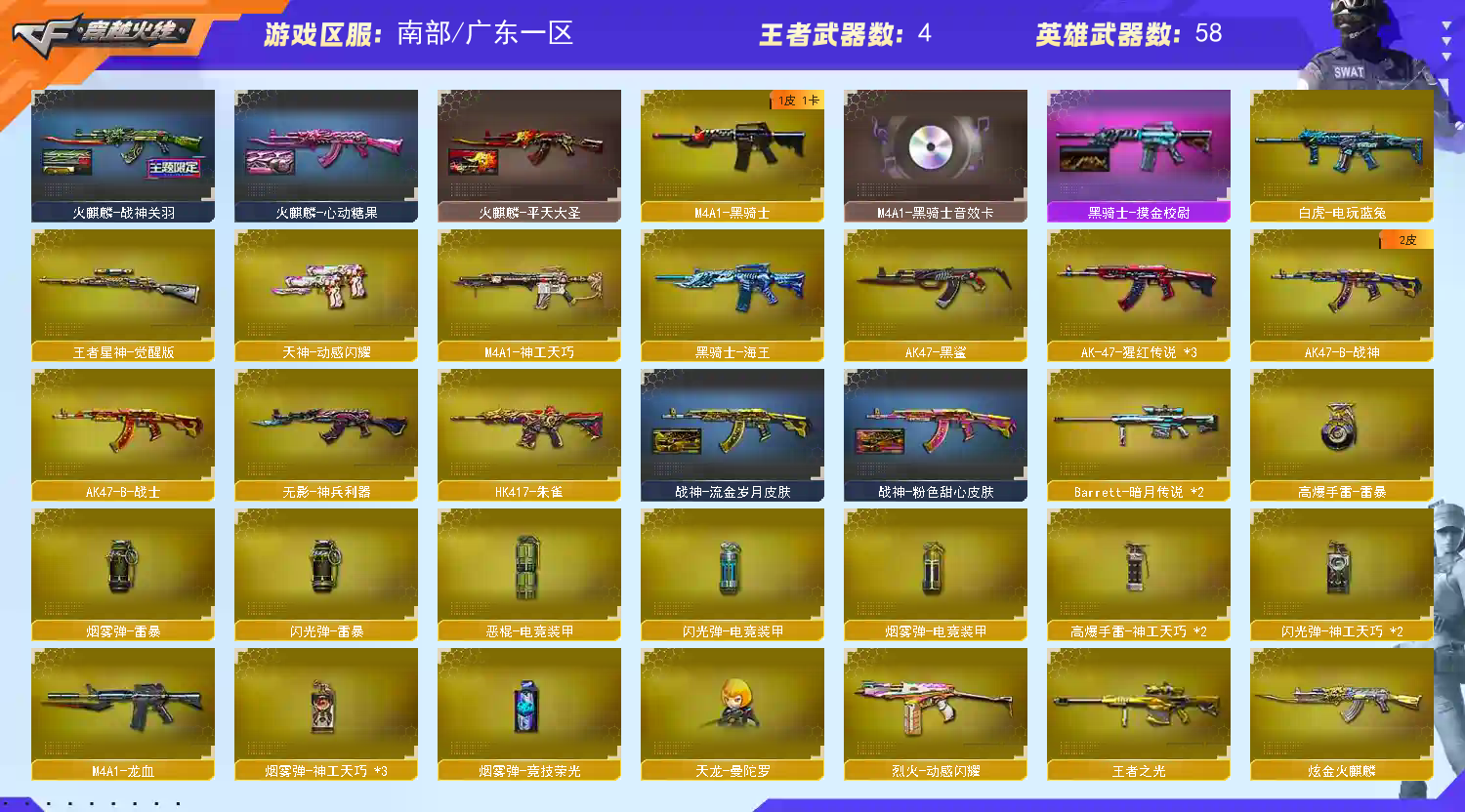 【广东一区】【可排位】【枪王1】【V武器数59】【幻神3皮】【金色蔷薇三件套】【神工天巧套装X2套】【雷暴套装X1套】【M200-幻神】【幻神-荣耀世冠EP 皮肤】【幻神-CFS2022】【M200-幻神-黄忠皮肤】【星神-CFS2025 皮肤】【王者星神-觉醒版】【AWM-裁决】【Scar Light-白虎】【ScarLight-白虎-冠军之虎皮肤】【白虎-AG-CFPLS20冠军】【白虎-电玩蓝兔】【QBZ03-金色蔷薇】【QBZ03-AG-CFPLS19冠军】【QBZ03-金色蔷薇音效卡】【M4A1-神工天巧】【柯尔特-冠军之特】【USP-神工天巧】【魂·炼狱-玩具枪】【兰-巾帼英雄】【奇洋探员】【乔伊教练】【王者春】【修道士】【M4A1-雷神】【雷神-荣耀之魄】【雷神-宠儿-2019MVP】【M4A1-雷神-CFS 2019】【雷神-赛博朋克】【AK47-火麒麟】【火麒麟-战神关羽】【火麒麟-平天大圣】【火麒麟-心动糖果】【火麒麟-CFSTAR】【M4A1-黑骑士】【黑骑士-摸金校尉】【黑骑士-摸金校尉】【M4A1-黑骑士音效卡】【黑龙-能量核心】【Barrett-毁灭】【毁灭-荣耀之怒】【毁灭-星空】【毁灭-直播专属 】【Barrett-毁灭音效卡】;柯尔特-冠军之特,炽芒蝶刃,妮妮,QBZ03-金色蔷薇,M200-幻神,Scar Light-白虎,